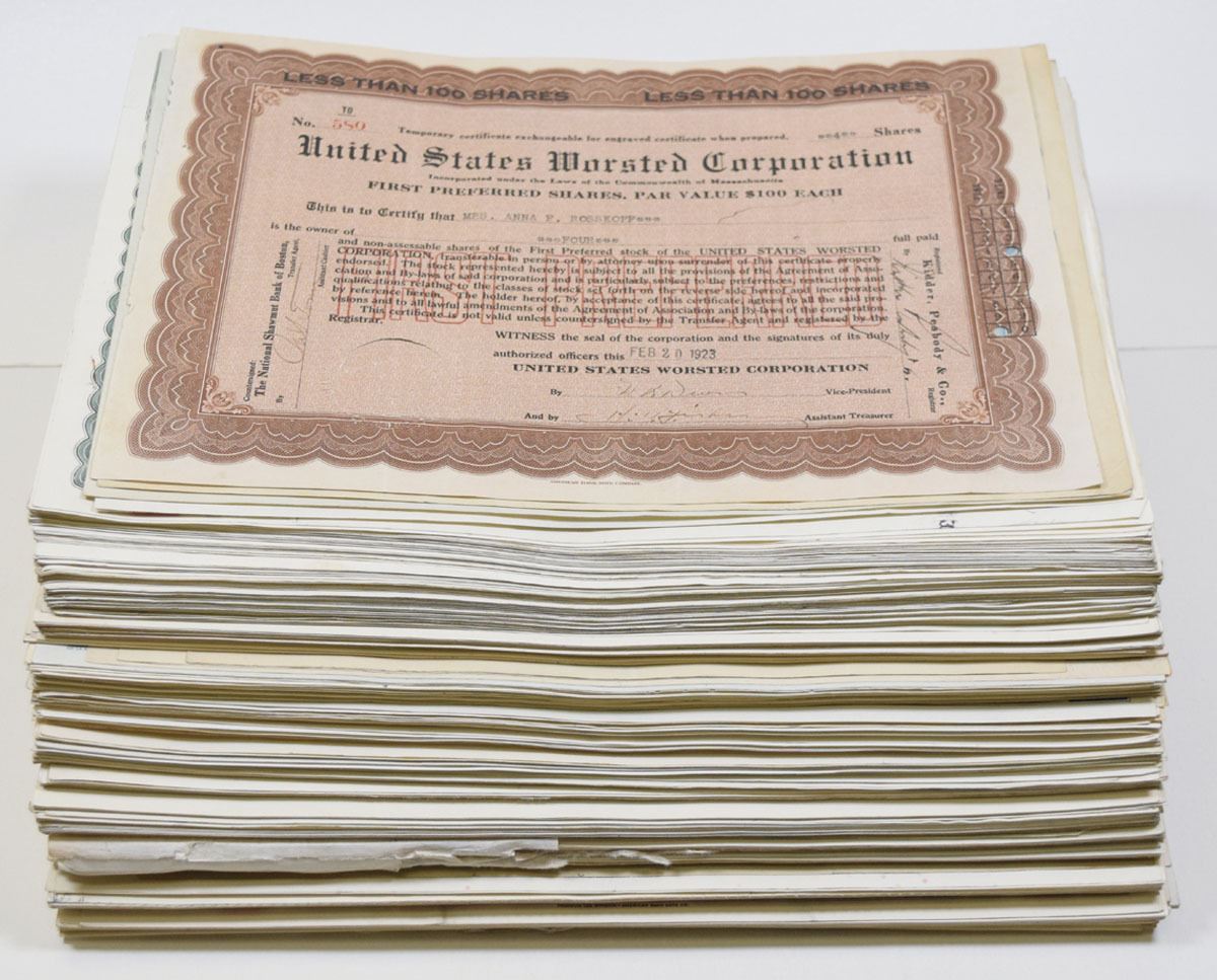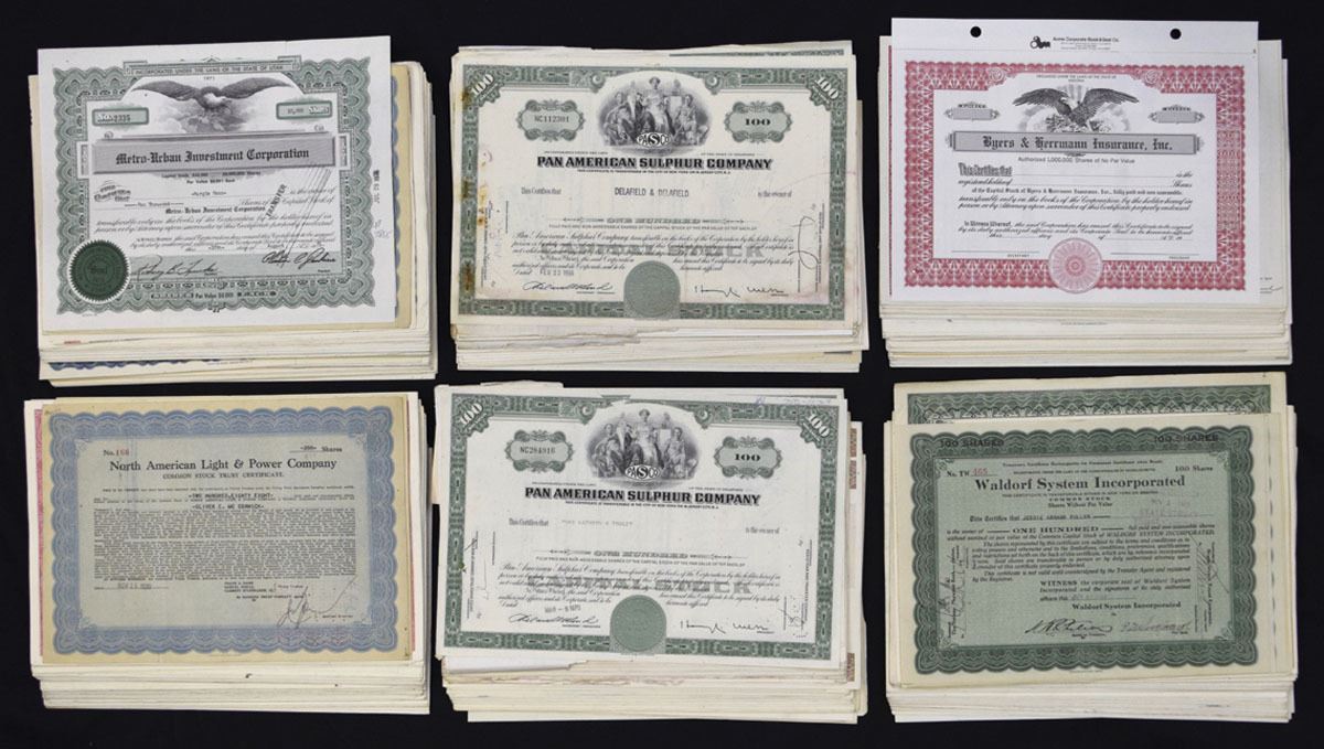 Lot of 200+ issued bonds and stocks. Lot includes such notable companies as; Great Atlantic & Pacific Tea Co. (1969), Honeycomb Systems, Inc. (1968), Alco Products Inc. (1961), Western Union, among others. All in Fine to Uncirculated condition.