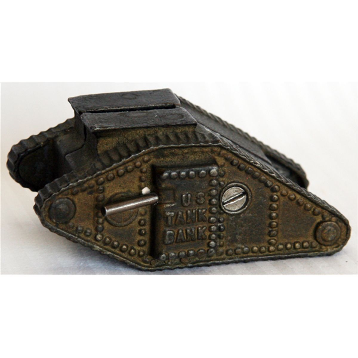 U.S. TANK BANK. World War I Tank. Coin opening on top. No handle, key, serial number or patent numbers. 10cm x 4 1/2cm x 5 1/2cm. Maker unknown. Fine.