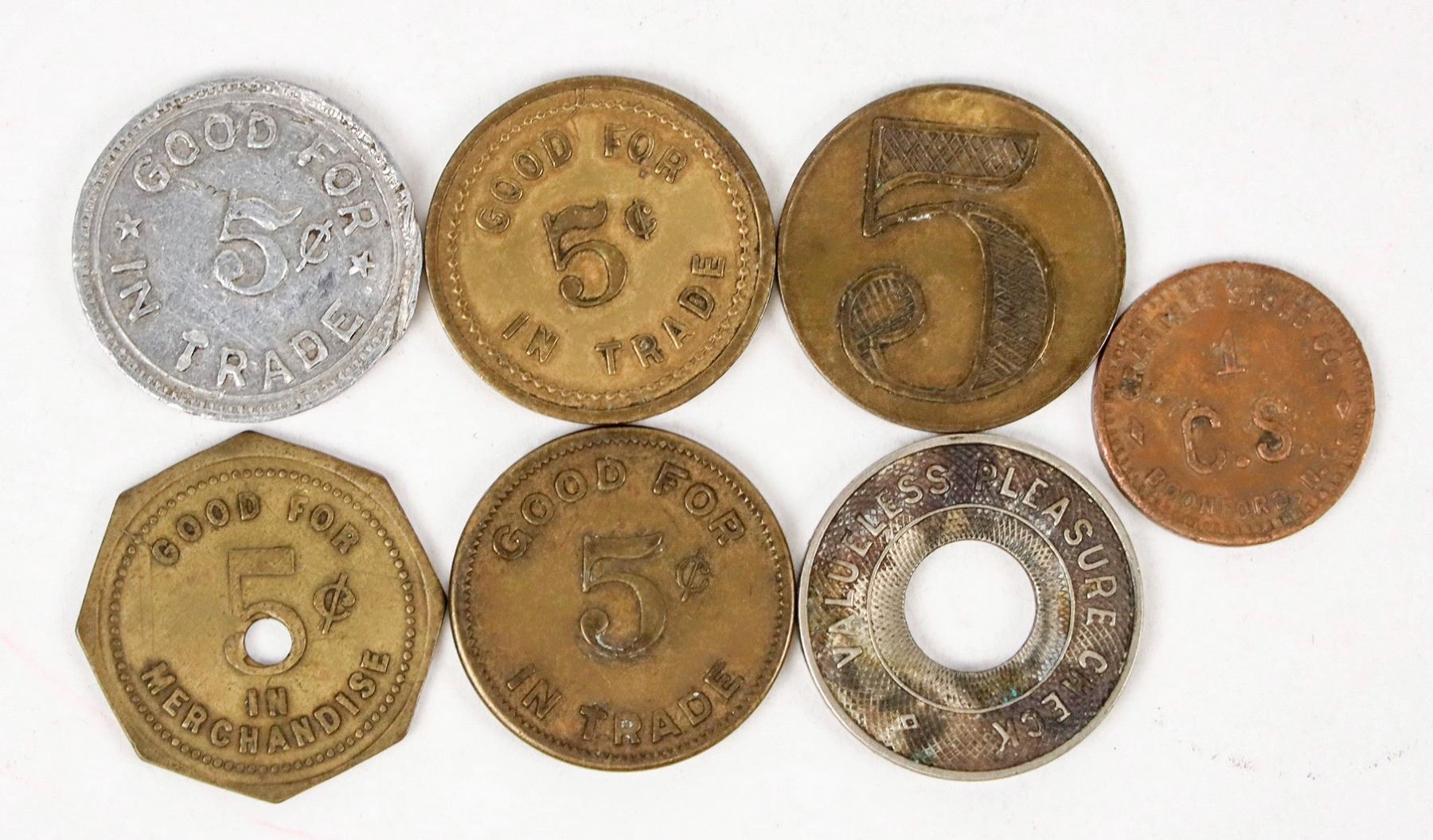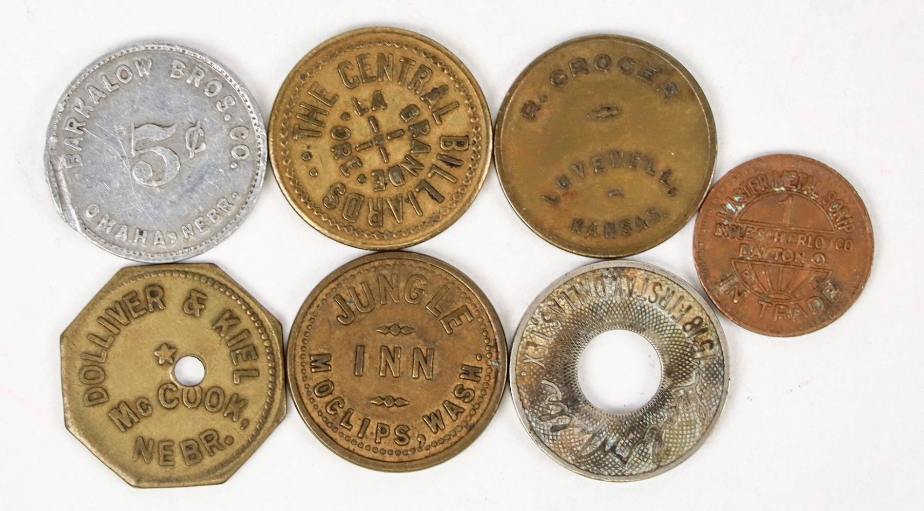 Miscellaneous U. S. tokens: Lovewell, KS; Dallas, TX; McCook, NE; Moclips, WA; Omaha, NE; La Grande, OR; Boonsford, NC.