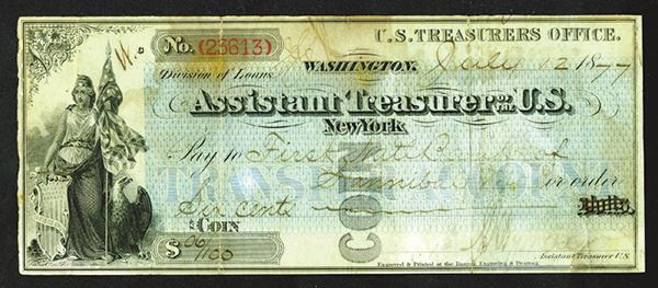 U.S. Treasury; Assistant Treasurers Office, check July 12, 1877.