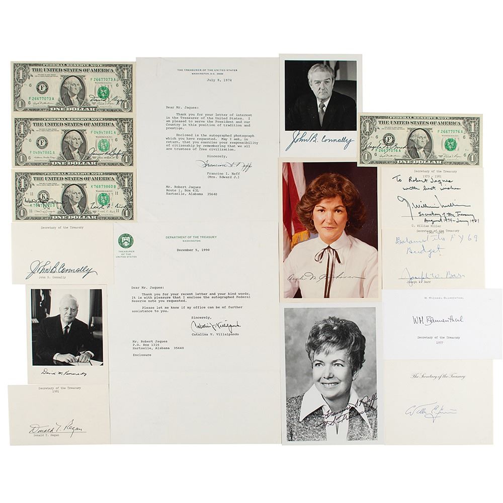 Group lot of 16 items signed by either a former United States Secretary of the Treasury or by a former Treasurer of the United States. The secretaries: James Baker (dollar bill), Joseph W. Barr (index card), W. Michael Blumenthal (personal stationery card), John Connally (2: SP and index card), David M. Kennedy (SP), G. William Miller (index card), Donald Regan (2: dollar bill and index card), and William E. Simon (stationery card). The treasurers: Angela Marie Buchanan (2: SP and dollar bill), Francine Irving Neff (2: TLS and SP), and ​​Catalina Vasquez Villalpando (2: TLS and dollar bill). Includes some transmittal letters and mailing envelopes. In overall fine condition.