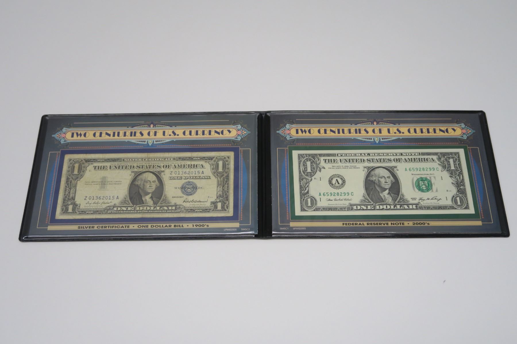 U.S. Two Centuries of U.S. Currency. 1957 $1 Silver Certificate & 2006 $1 Federal Reserve Note. Housed in a black folder.