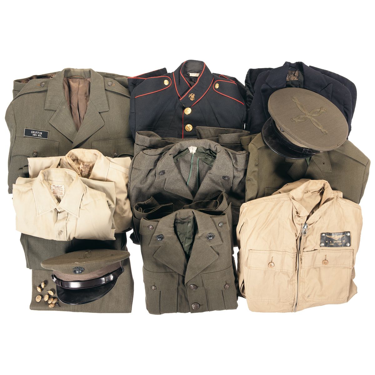 2 USMC visors, summer flight suit with USN CDR. W.E. Griffin Jr. name tag, USN aviation green dress coat, USMC sergeant service dress coat with shirt, 10 USMC service dress coats, 2 USAF khaki shirts, 4 trousers, white Navy jacket, Navy lieutenant dinner dress coat. Overall in good or better condition.