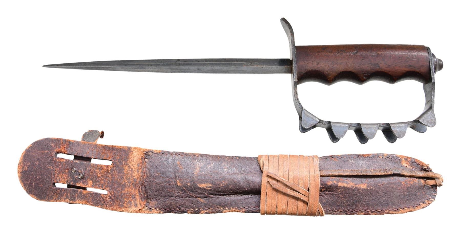 WITH SCABBARD. U.S. M1917 fighting knife mfg. by O.C.L. (Oneida Community LTD.) in 1918. Top of the guard is marked "U.S. O.C.L./ 1918". The triangular blade measures 9", with an overall length of 14 1/4". Metal components exhibit a blue finish overall. 1-piece grooved wood handle, with a folded metal guard, featuring 5 flanges on either side of the knucklebow. UNATTACHED ACCESSORIES: brown leather scabbard. CONDITION: metal components retain the majority of their original blue finish, exhibiting some spots/areas of wear and thinning that show through to gray patina, as well as scattered spots of light to mild surface oxidation and pitting overall. Blade exhibits some scattered nicks to its edges. Handle shows scattered superficial marks and impressions from handling and storage, but otherwise remains sturdy and serviceable. Scabbard shows wear, with areas of age related cracking and crazing. Retention strap is torn, with the button no longer being present. (02-24408/MLW). $500-800.