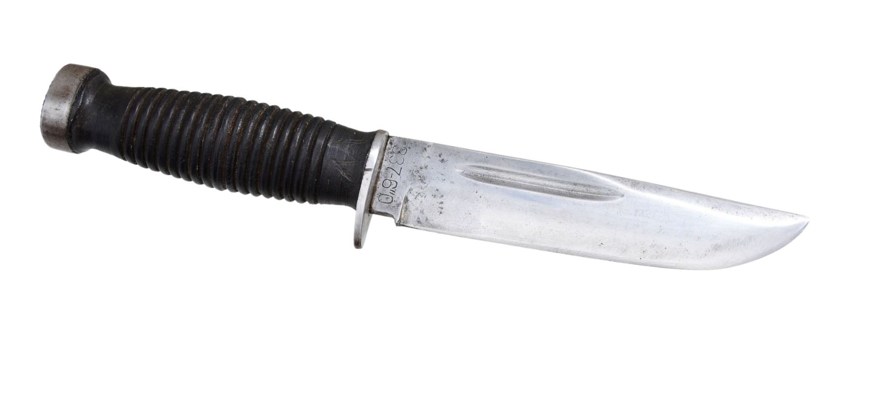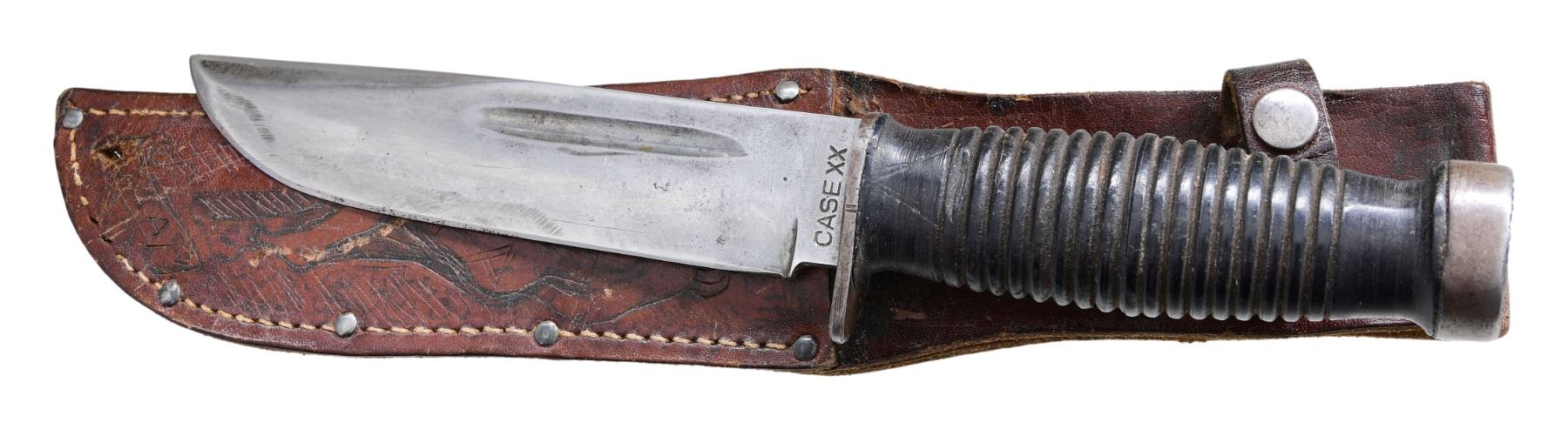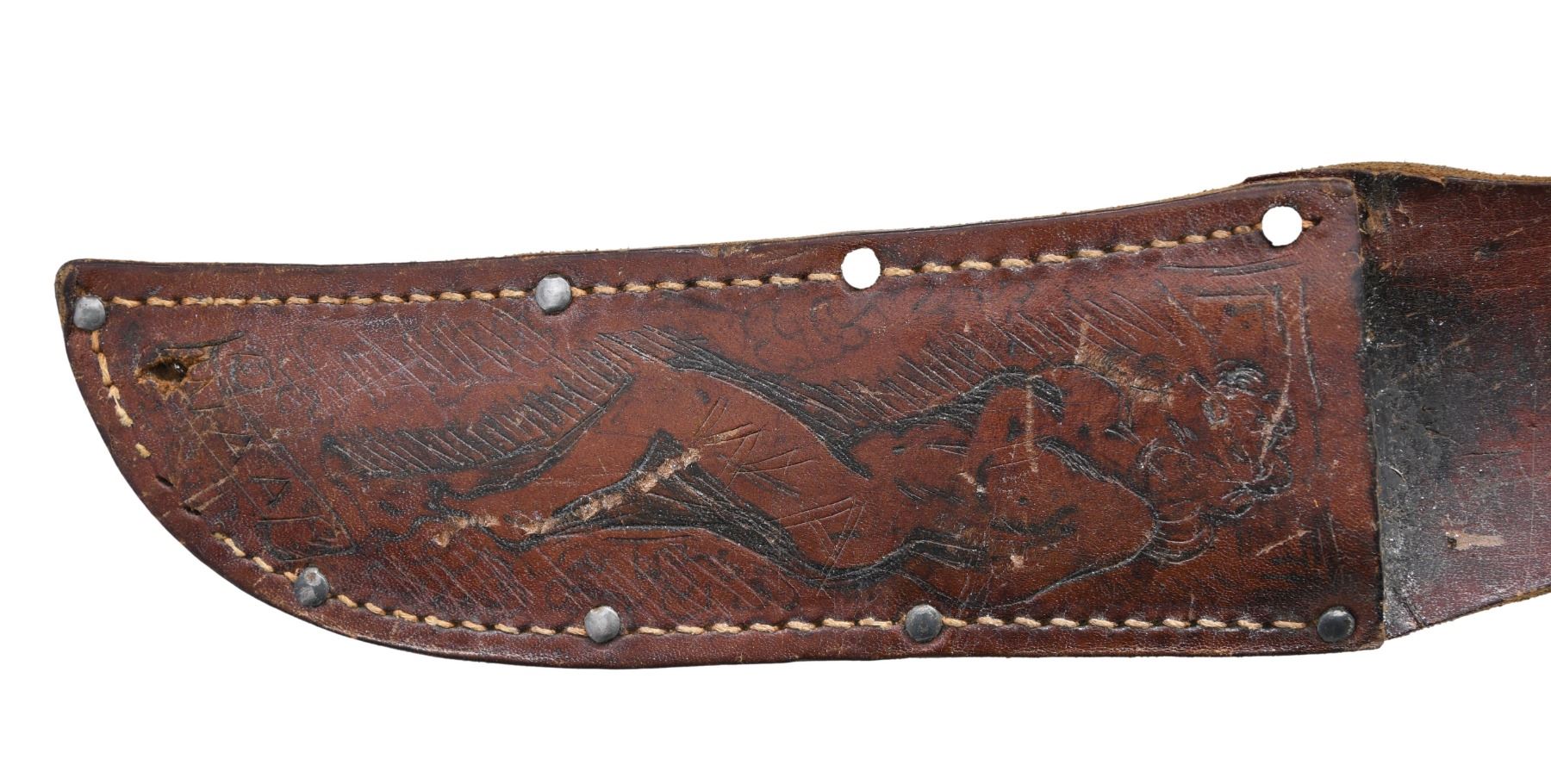WITH SHEATH. 337-6Q (Quartermaster) fighting knife mfg. by Case. Left side of the ricasso is marked "CASE XX", with "337-6"Q" marked on the right. The blade measures 6" in length, with an overall length of 10 3/4". Handle is comprised of grooved brown leather, featuring a steel half guard and a textured pommel. Handle is carved "W" on one side, with a triangle or "V" carved on the reverse. UNATTACHED ACCESSORIES: brown leather sheath, embellished with a hand carved pin up girl on the front and "A7283" on the rear. CONDITION: blade has been cleaned, exhibiting scattered spots of light to mild pitting, with sharpening marks present along the edge. Handle is good, showing some wear and scattered superficial handling marks. Sheath remains malleable, exhibiting some wear, with some age related cracking and crazing. (02-24409/MLW). $200-350.
