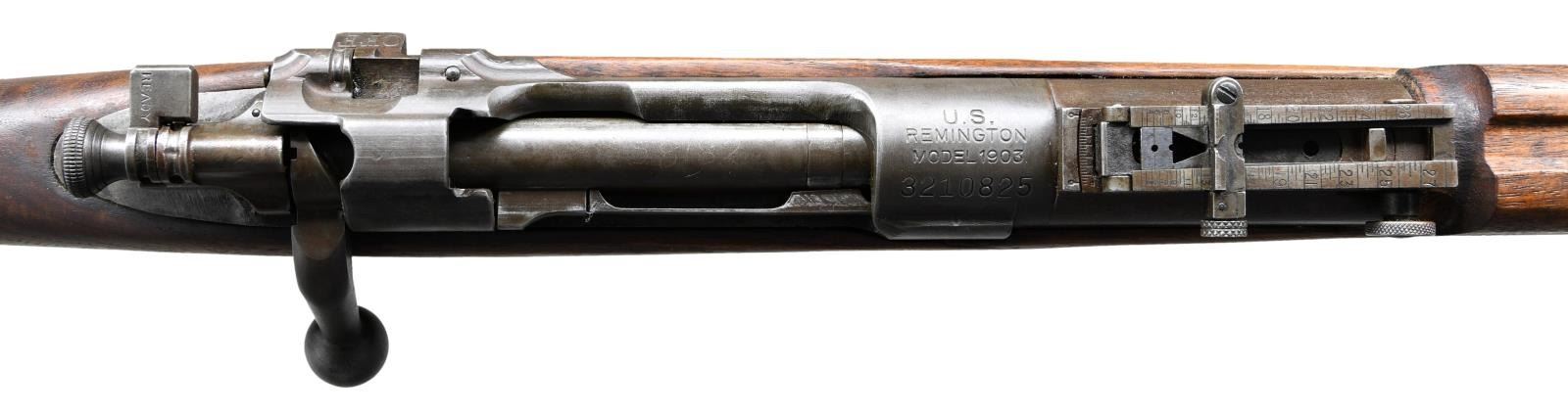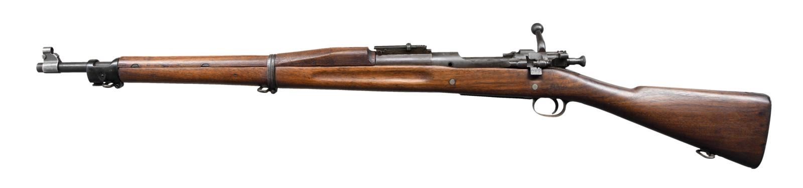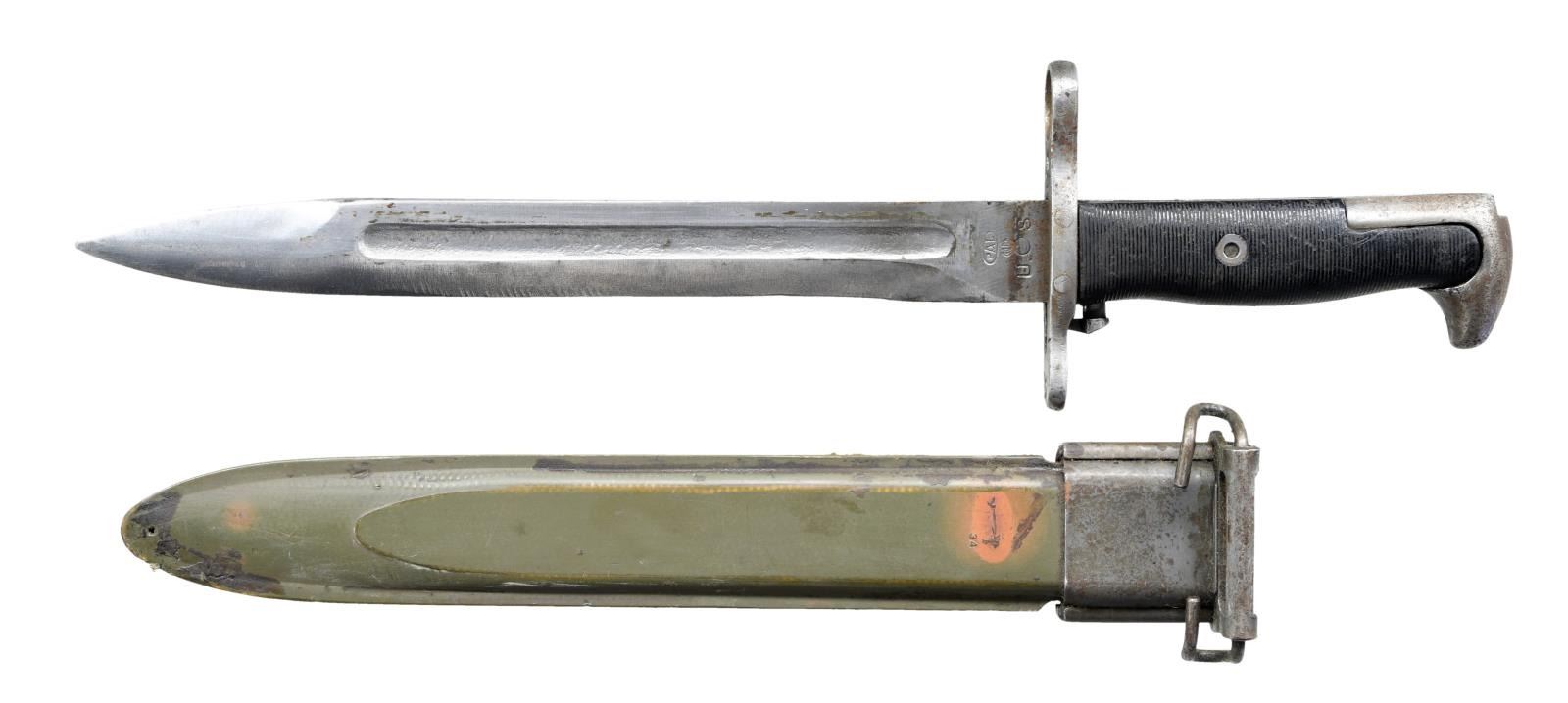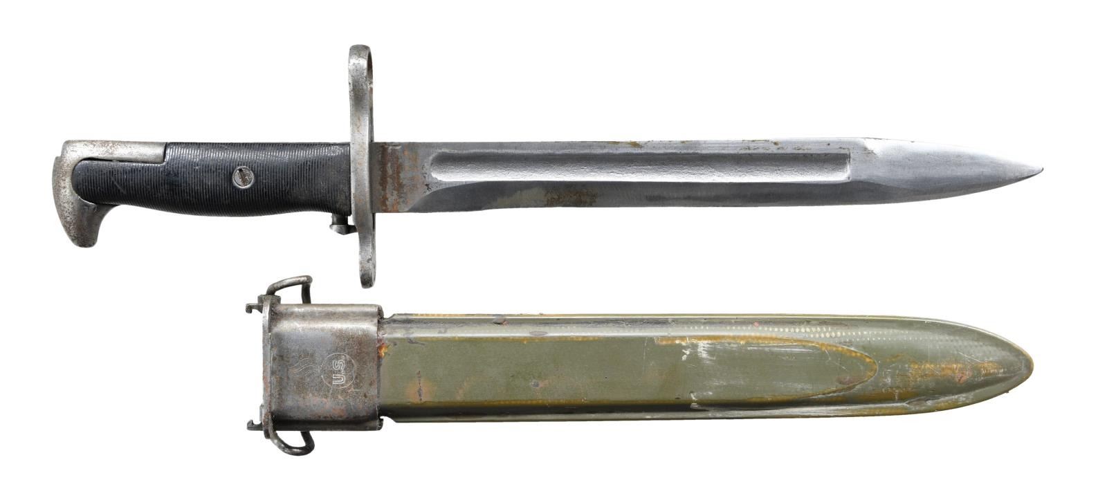 Cal. 30-06. S# 3210825. Bbl. 24", marked behind front sight w/ "RA flaming bomb 7-42". Ladder rear sight w/ volley notch. Graduated to 2850 yards. Dished elevation knob; flat windage knob. Blade front sight w/ unmarked stamped sight protector. Rear sight base made w/out lightening. Rear receiver has "Hatcher Hole". Bolt is marked "J5" under safety lug & has proof punch mark underneath bolt handle. Balance of bolt parts are unmarked. Cutoff is marked "R". Grooved trigger. Milled trigger guard & floorplate. S type straight grip stock w/ grasping grooves plus 2 recoil bolts. Stock marked on left side over trigger guard w/ faint boxed acceptance mark & unboxed "R-A-P" arsenal rework marking. All milled furniture except butt swivel which is stamped. Smooth trap buttplate. UNATTACHED ACCESSORIES: 9 3/4" fullered blade M1 bayonet marked on left ricasso "PAL" in oval & "US" in flaming bomb. Nickel plated oiler in butt. Birdshead pommel. Grooved plastic grips. Green plastic scabbard w/ metal throat and belt hook. Throat is marked w/ flaming bomb. Blade has been sharpened and has a degree of sweep but still fits the scabbard. Metal is mostly bright retaining little of its original finish w/ wear, staining & peppery oxidation. Scabbard is well worn but serviceable. CONDITION: stock has been refinished w/ notable loss of wood in inletted areas plus softening of edges. This refinish has rendered markings obscure. Metal retains a degree of original wartime finish w/ a somewhat mixed appearance as many parts are serviceable arsenal rebuild replacements. Good shiny bore w/ lightly worn lands. (23-1166/RW). CURIO. $400-600.