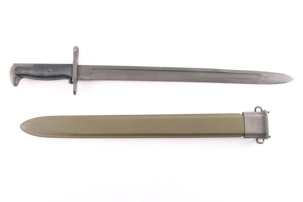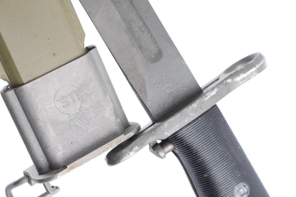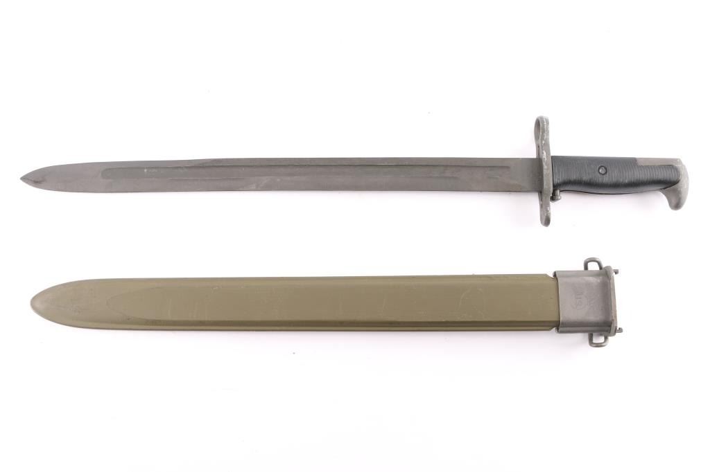 U.S. bayonet for the M1 and Springfield rifle. 1) 1942 production M1905 bayonet, 16" parkerized blade, ricasso stamped "U.S.(flaming Bomb in center), 1942" and "PAL" in circle. (PAL blade & Tool Co. Plattsburg, NY). OD green fiberglass scabbard, steel throat stamped "U.S." in flaming bomb. Both in excellent condition.