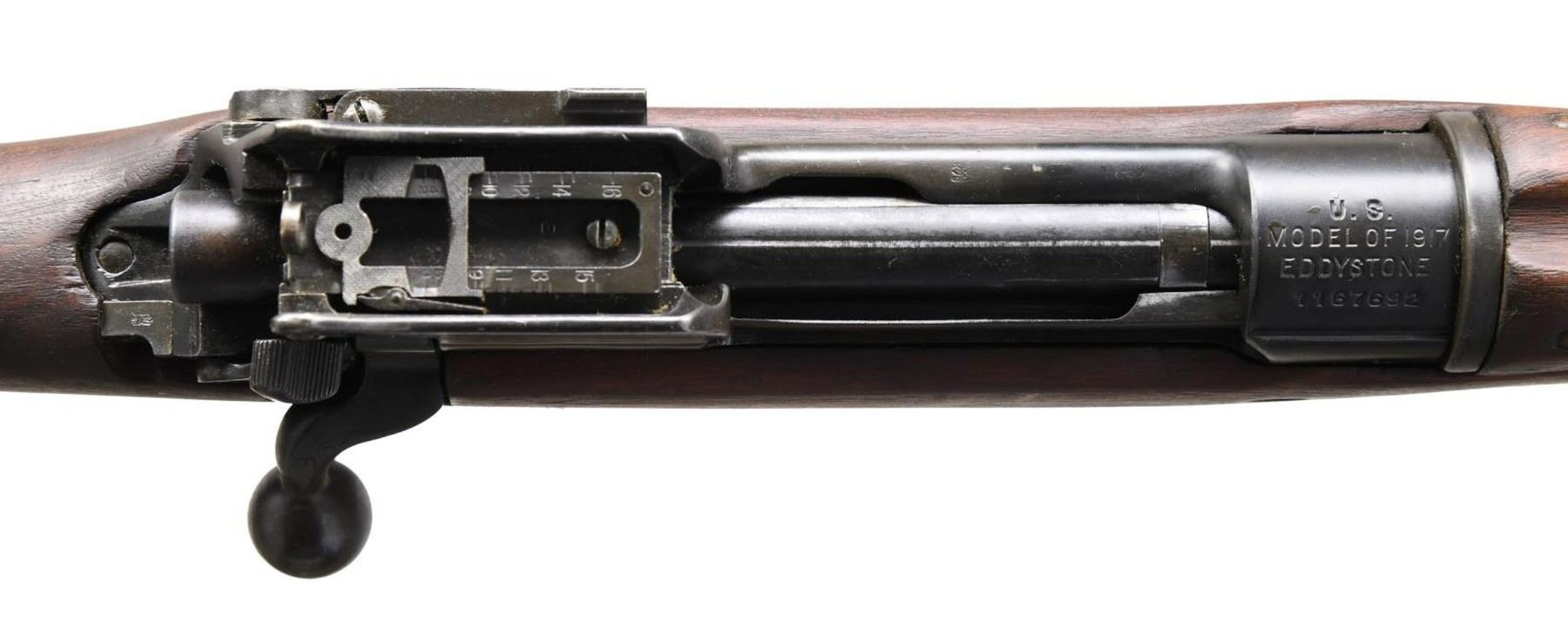 RIFLE. Cal. 30-06. S# 1167692. Bbl. 26" Hi-Standard replacement barrel marked behind front sight "HS (flaming bomb) P" proof. Ladder aperture rear sight graduated to 1600 yards. Blade front sight with protective ears. Receiver is marked on left side with flaming bomb, and marked on top of left rail a partially struck eagle proof. Rear sight, safety, bolt and upper band marked "E". Cocking piece and forend tip marked "W". Walnut stock set. Stock has very faint boxed acceptance mark over trigger guard. Illegible boxed marking on left side of grip. Marked underneath grip with boxed "P" proof. Smooth trap buttplate. "KERR NOBUCKL" web sling. CONDITION: stock set has very good arsenal rework finish with light wear and scattered handling marks. Inletted repair at bottom of forend near upper band. Metal retains a large degree of arsenal rework finish with thinning and light wear. Very good, shiny bore. PROVANANCE: the Lifelong Collection of Terrence McCarty. (24-356/RW). CURIO. $350-500.