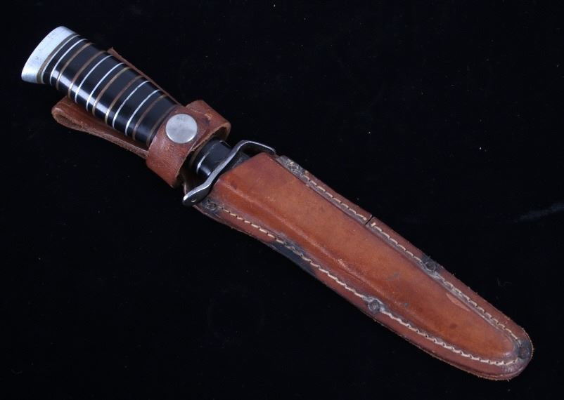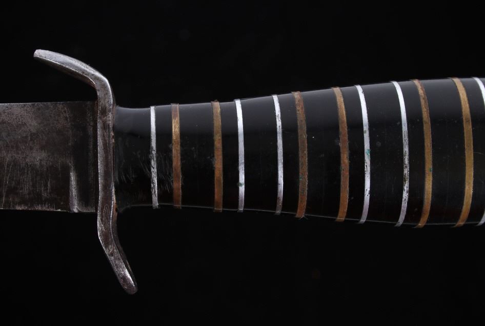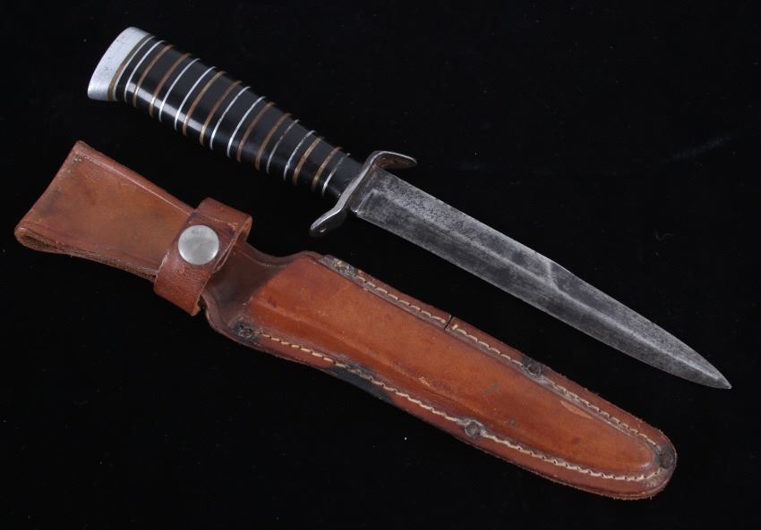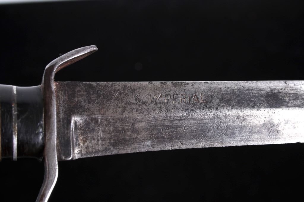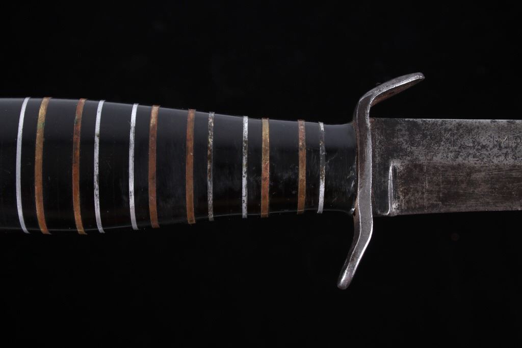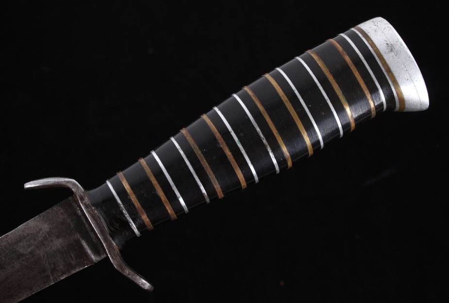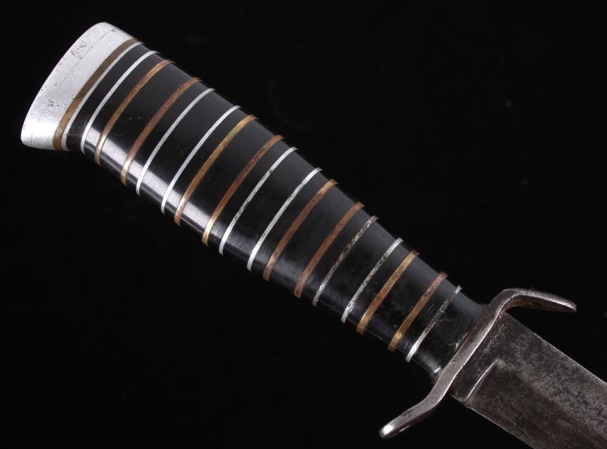 Featured in this lot is this U.S. WWII ARMY M3 fighting knife, circa 1945. The knife features a full tang M3 ARMY fighting knife with a replaced composite handle, layers of composite, and aluminum rings. The condition of this knife is good; the handle has been replaced with composite material, but the knife shows oxidation and is in good overall condition; the sheath shows patina with some cuts in the sheath and a piece cut out of the button strap. The measurements of this knife in sheath are 11 1/4" x 2" x 1 3/8" and the blade length is 6 3/8".