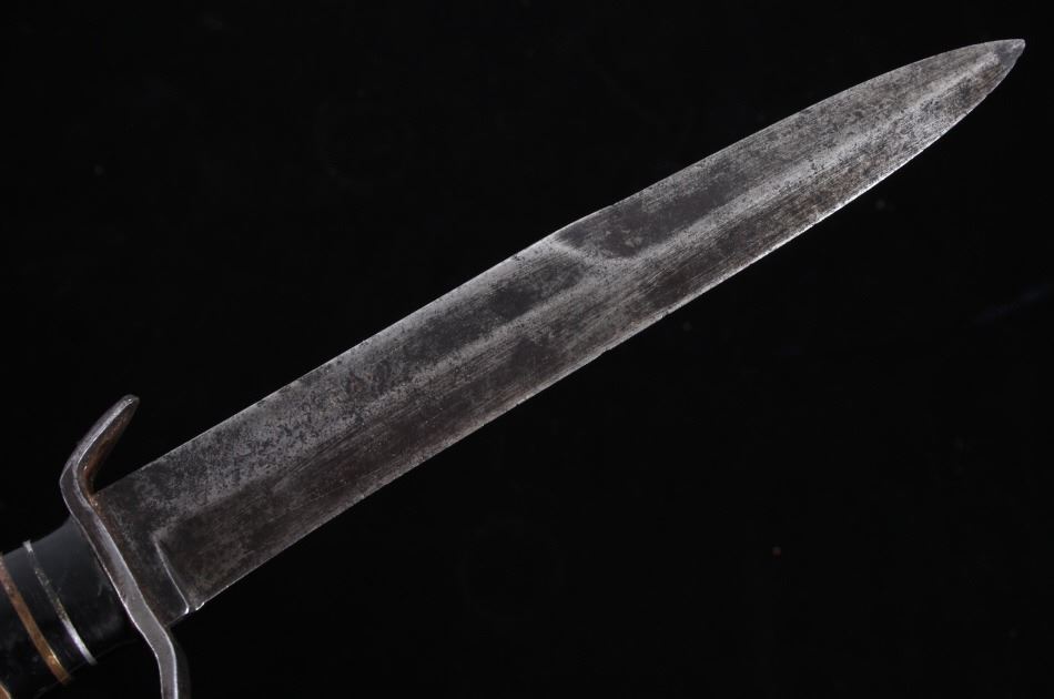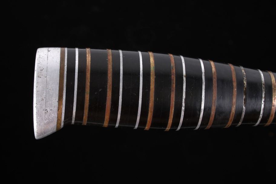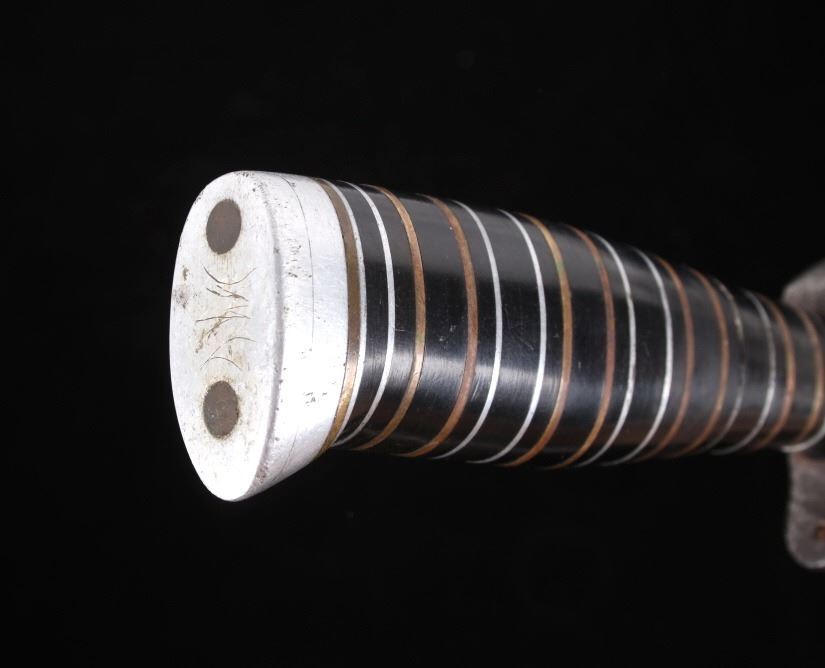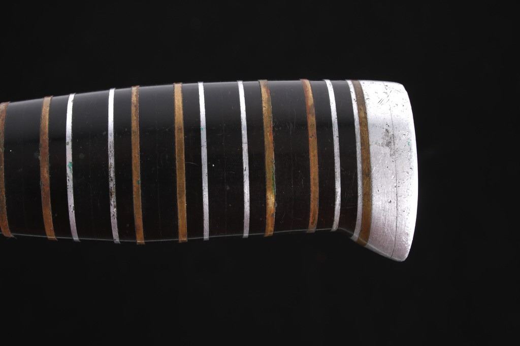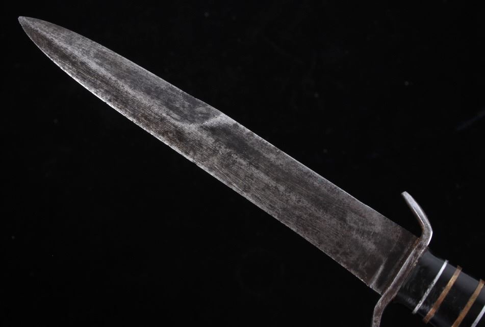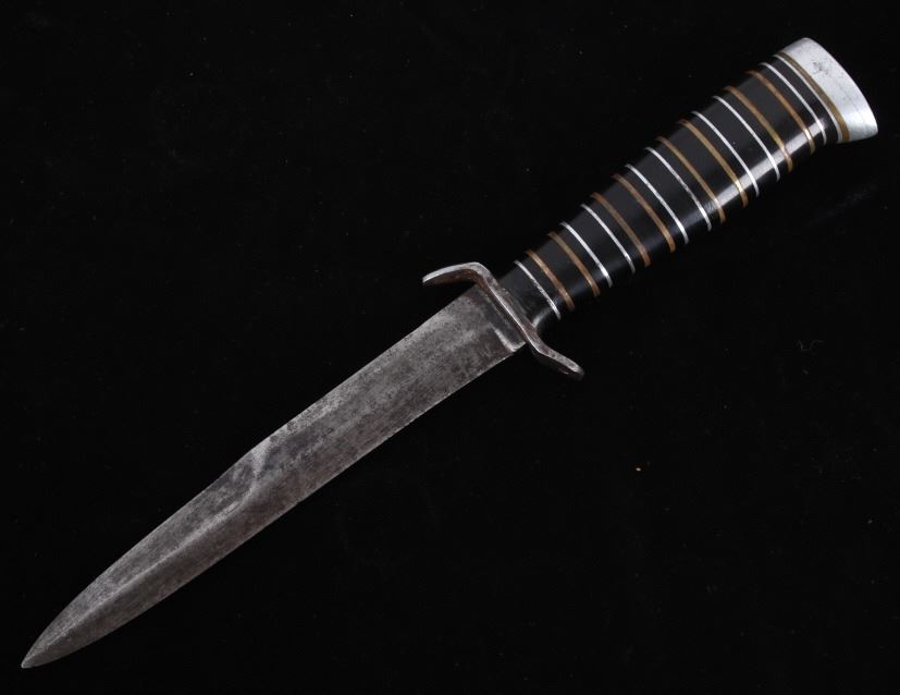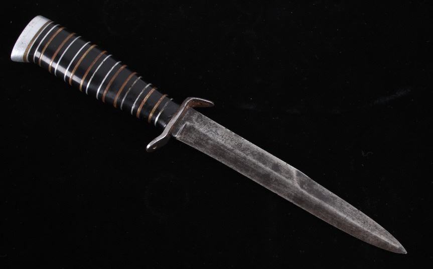 Featured in this lot is this U.S. WWII ARMY M3 fighting knife, circa 1945. The knife features a full tang M3 ARMY fighting knife with a replaced composite handle, layers of composite, and aluminum rings. The condition of this knife is good; the handle has been replaced with composite material, but the knife shows oxidation and is in good overall condition; the sheath shows patina with some cuts in the sheath and a piece cut out of the button strap. The measurements of this knife in sheath are 11 1/4" x 2" x 1 3/8" and the blade length is 6 3/8".