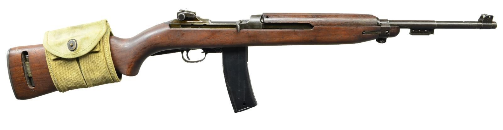 CARBINE. Cal. 30 Carbine. S# 798567. Bbl. 18" marked behind front sight "INLAND MFG. DIV. GENERAL MOTORS 8-43". Stamped adjustable rear sight. Blade front sight w/ protective ears marked "R". Bbl. band w/ bayonet lug marked "SI". 6 O'clock slide marked "PI". Flat bolt marked "S". Milled trigger housing marked "INLAND". Rotary safety. Flat cut hammer marked "HI". Low wood oval cut buttstock marked on right side w/ "crossed canons". Marked in sling slot "HI". 2-rivet handguard marked "P" & "J". Green web sling. UNATTACHED ACCESSORIES: green web slip-on mag. pouch. MAGS: 1-30 rd. marked "M2". CONDITION: stock set has nice arsenal rework type finish leaving markings intact w/ very light wear & scattered handling marks. Handguard has lightly worn original finish. Metal has thinning w/ approx. 50% original Parkerized finish w/ wear & scattered handling marks. Very good shiny bore w/ sharp lands. (22-4132/RW) CURIO. $800-1,200.