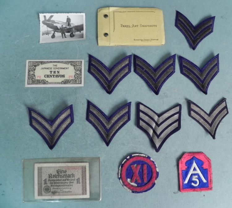 U.S. WWII PATCH, CURRENCY & PHOTO COLLECTION-14 PCS NICE COLLECTION OF MILITARY-INCLUDING PHOTO OF PILOTS AND BOMBER WITH NOSE-ART