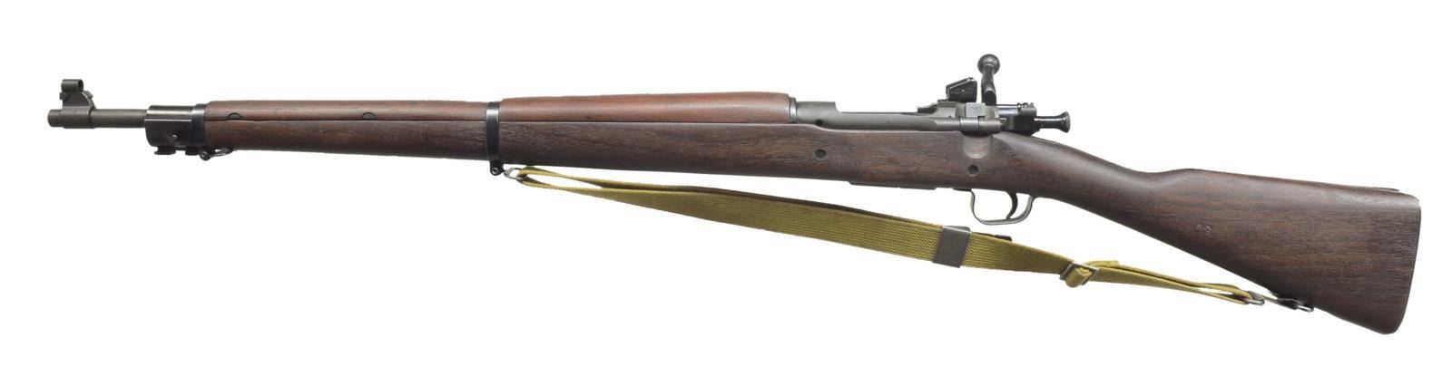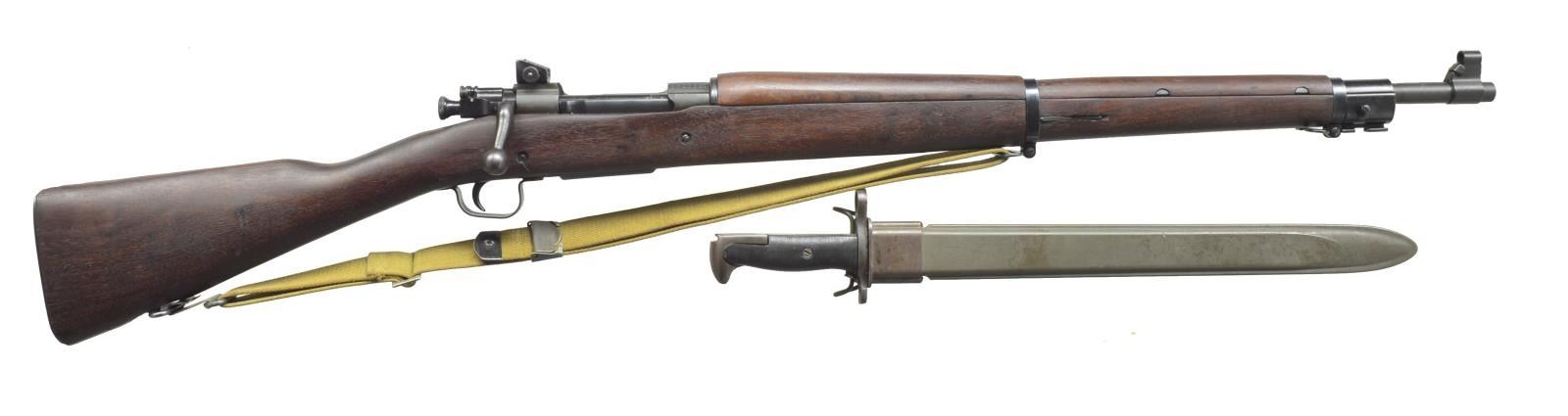 Cal. 30-06. S# 3523991. Bbl. 24". Very nice correct example of Remington made 1903 A3 rifle w/ crisp markings. 2-Grooved bbl. marked "RA" flaming bomb "12-43". Adjustable aperture rear sight. Blade front sight w/ protective hood. All visible markings are "RA". All stamped furniture, including lg. bow trigger guard. Walnut stock set straight grip buttstock w/ 2 recoil bolts is marked on left side w/ unboxed "RA", "FJA", "OG". Marked under grip w/ circle "P" & numerous inspector marks forward of trigger guard. Green web sling. UNATTACHED ACCESSORIES: 15 3/4" fullered blade bayonet. Bayonet marked on left ricasso "U.F.H" flaming bomb "US" "1943". Fine grooved black composite grips & green composite scabbard w/ steel throat marked w/ flaming bomb & "U.S." Bayonet retains 75% original gray Parkerized finish w/ light wear, scattered scratches. Bayonet has been lightly sharpened. Scabbard is in good serviceable condition. Also included is American Rifleman magazine article entitled "The Remington" by Bruce Canfield. CONDITION: stock set has very nice original finish w/ scattered sm. handling marks. Metal has 90% original finish w/ light high point wear. Near excellent shiny bore. (20-3374/RW). CURIO. $600-900.