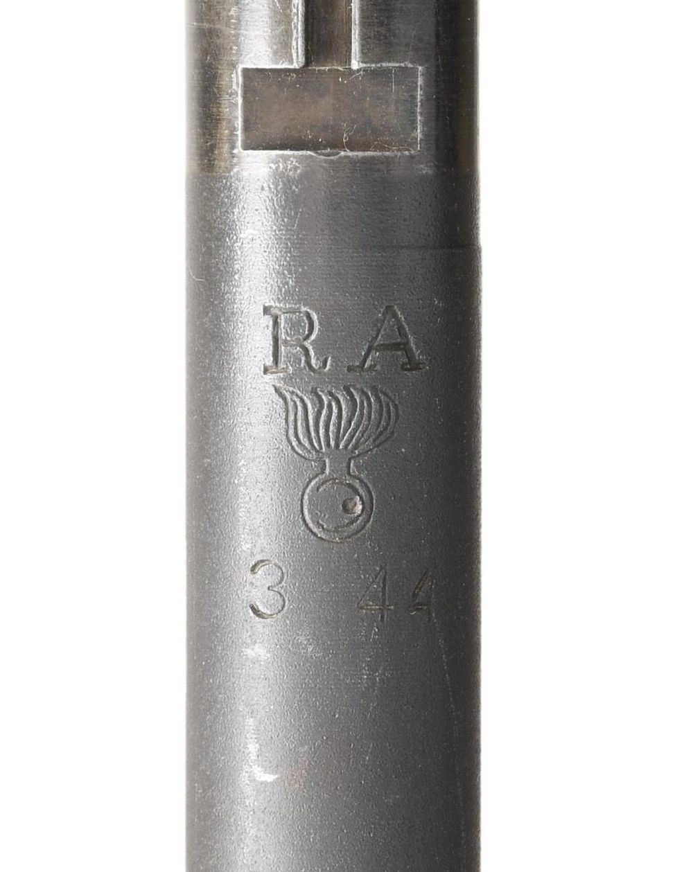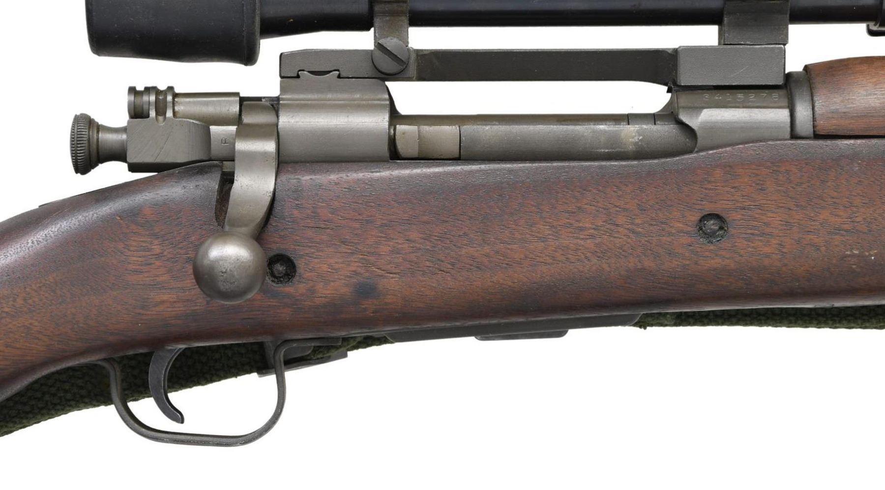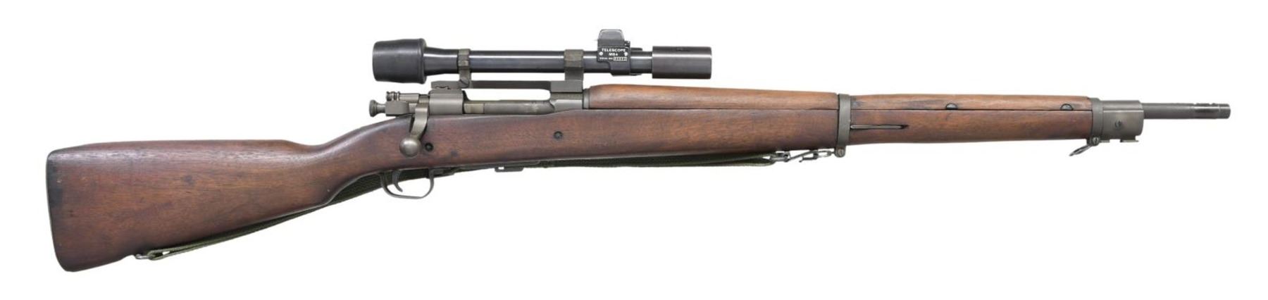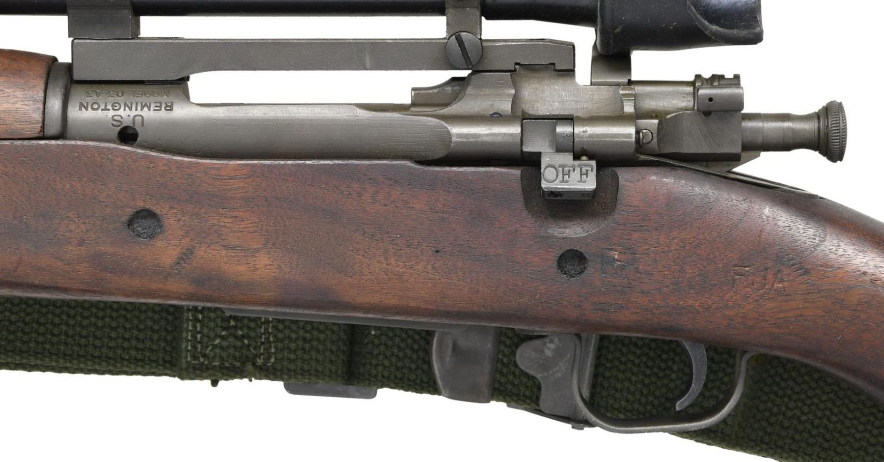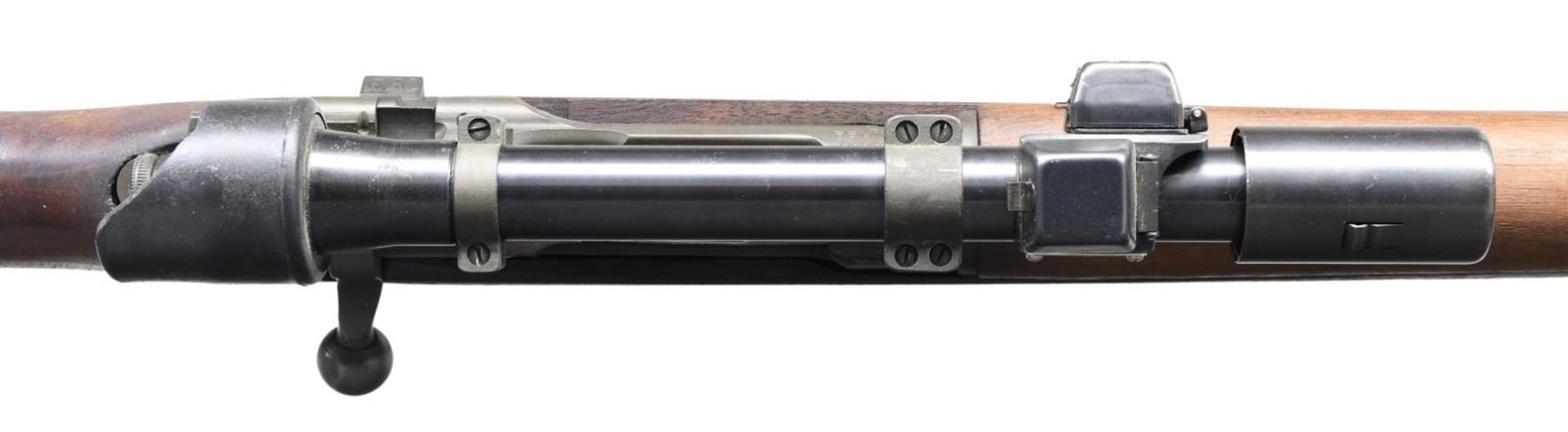 MILITARY SNIPER RIFLE WITH M84 SCOPE. Cal. 30-06. S# 3415278. Bbl. 24". Replacement bbl. is marked at forward end "RA" flaming bomb, "3-44". Bbl. was fitted with front sight. Receiver markings are offset correctly and are "U.S. / REMINGTON / MODEL 03-A3". Receiver has correct bevel for bolt handle. Correct bolt has only punch mark underneath bolt handle. Bolt sleeve and safety marked "R". Mag. cutoff marked "R". Unmarked one piece scope base with correct bevel at rear. Two mounting screws. Screw heads have been staked. M84 Scope with blued steel tube. Rubber eyepiece & sliding sunshade. Turrets are fitted with flip up dust caps. Nomenclature plate on right side marked "TELESCOPE / M84 / SERIAL NO 46643" boxed in white. Non tapered post reticle with horizontal crosshair. All stamped furniture with greenish parkerized finish. Large bow trigger guard. Fine checkered buttplate. Walnut stock set. Scant grip stock is marked on left side over trigger guard with "FJA" crossed cannons, "RA". Cutout recess marked with "K". Forend tip marked "CD". Circle "P" proof under grip. Crisp assembly numbers in front of trigger guard. Stock with 2 recoil bolts has correctly machined cutout to clear the bolt handle. Green web sling. CONDITION: stock set has original finish with legible markings. Very light wear and small scattered handling marks. Metal retains a very large degree of the arsenal rework. Greenish parkerized finish. Front sight area has notable more polished appearance. Near excellent shiny two groove bore. PROVENANCE: from The Working Reference Collection of Military Arms Instructor, Master Sergeant Vincent Pestilli. (23-7577/RW). CURIO. $1,500-2,500.