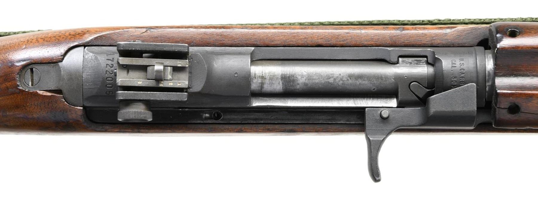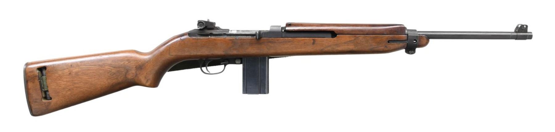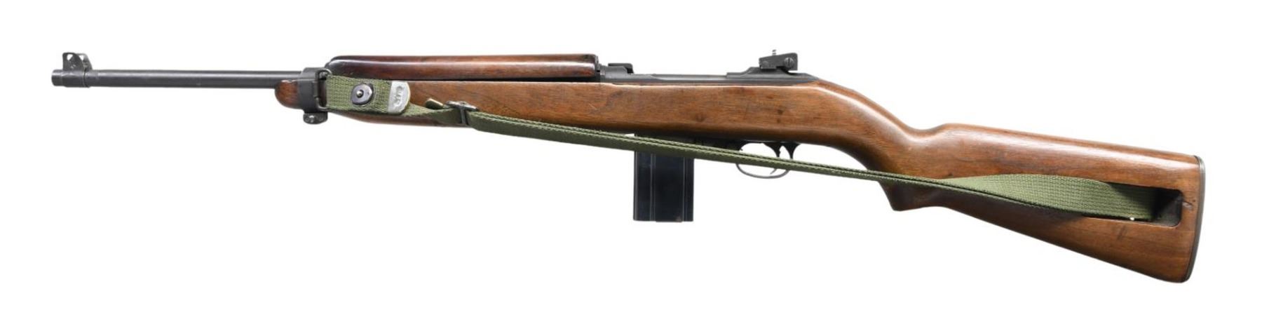 Cal. 30 Carbine. S# 1722005. Bbl. 18" marked behind front sight w/ "W" & Winchester proof. Milled adj. aperture rear sight marked on left side w/ faint crossed cannons. Blade front sight w/ protective ears. Wide bbl. band marked "IP". Wire type swivel. Straight cut slide marked "S". Rd. bolt marked ".U." Milled trigger guard marked on left side "N16". Rotary safety. Mag. catch with 30 rd. extension. Straight cut hammer marked with ".U." "I" cut low wood walnut stock marked on left side of butt "STD" / "PROD" / "RWH". Marked in sling slot "RMC". 2 Rivet bull nose handguard marked inside "Z". Green web sling. MAGS: 1 - 15 rd. CONDITION: stock has light wear & scattered handling marks w/ original finish and legible markings. Handguard has added finish plus 2" crack on right side through the rivet hole. Metal has approx. 75% of worn arsenal rework finish w/ spots of missing finish. Good shiny bore w/ hint of frosting in grooves. (24-766/RW). CURIO. $1,200-1,800.