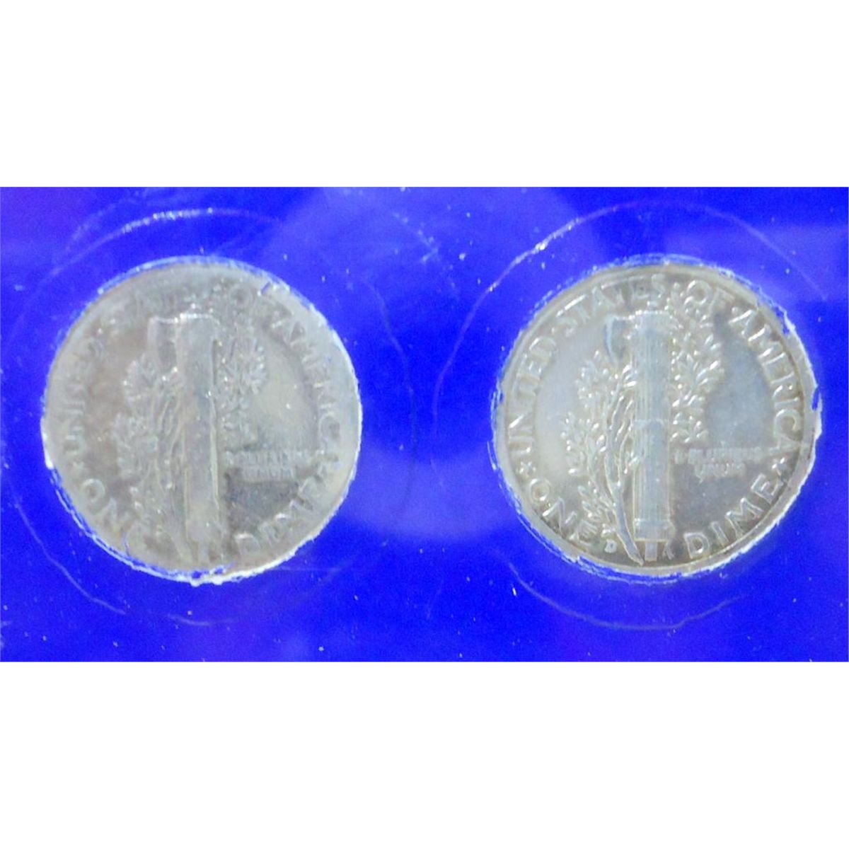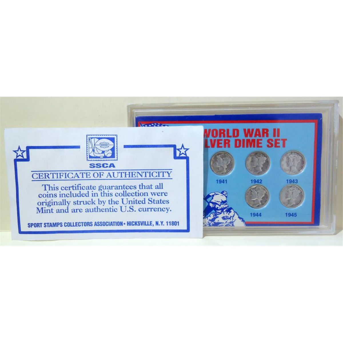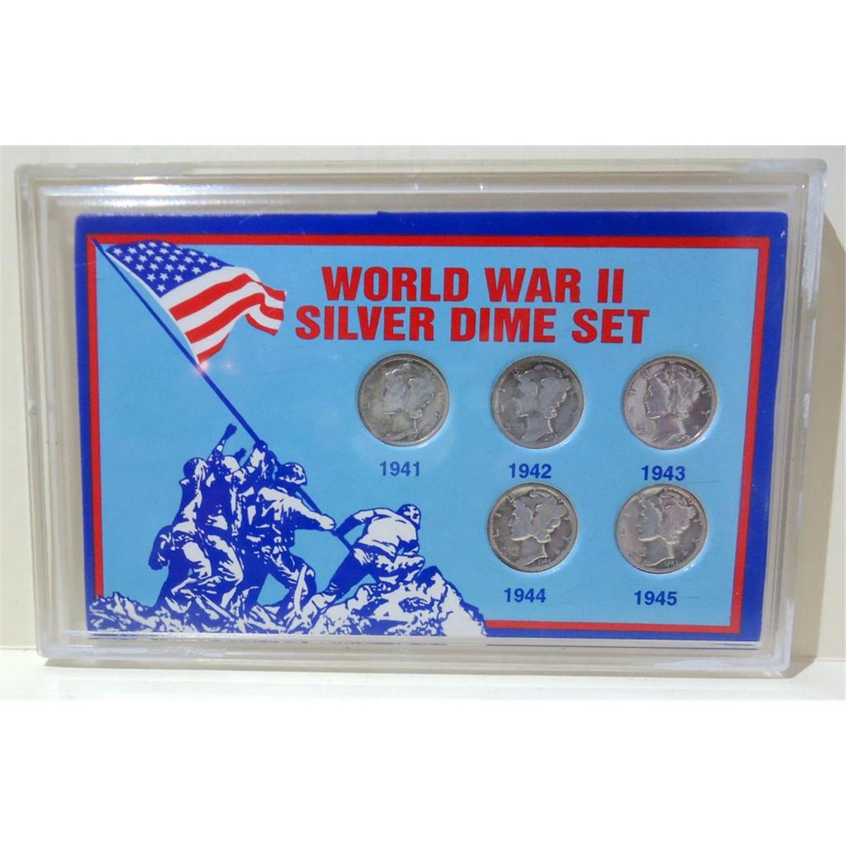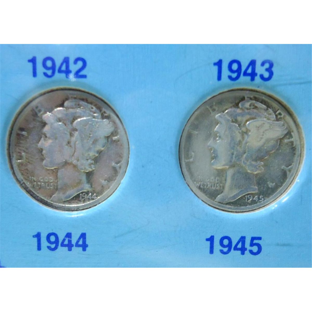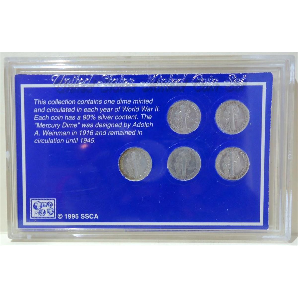 U.S Minted Coin Set Collection Contains one Dime Minted and Circulated in Each Year of WWII. Each Coin Has 90% Silver Content. The " Mercury Dime" Was Designed By Adolph A. Weinman in 1916 and Remained in Circulation Until 1945.