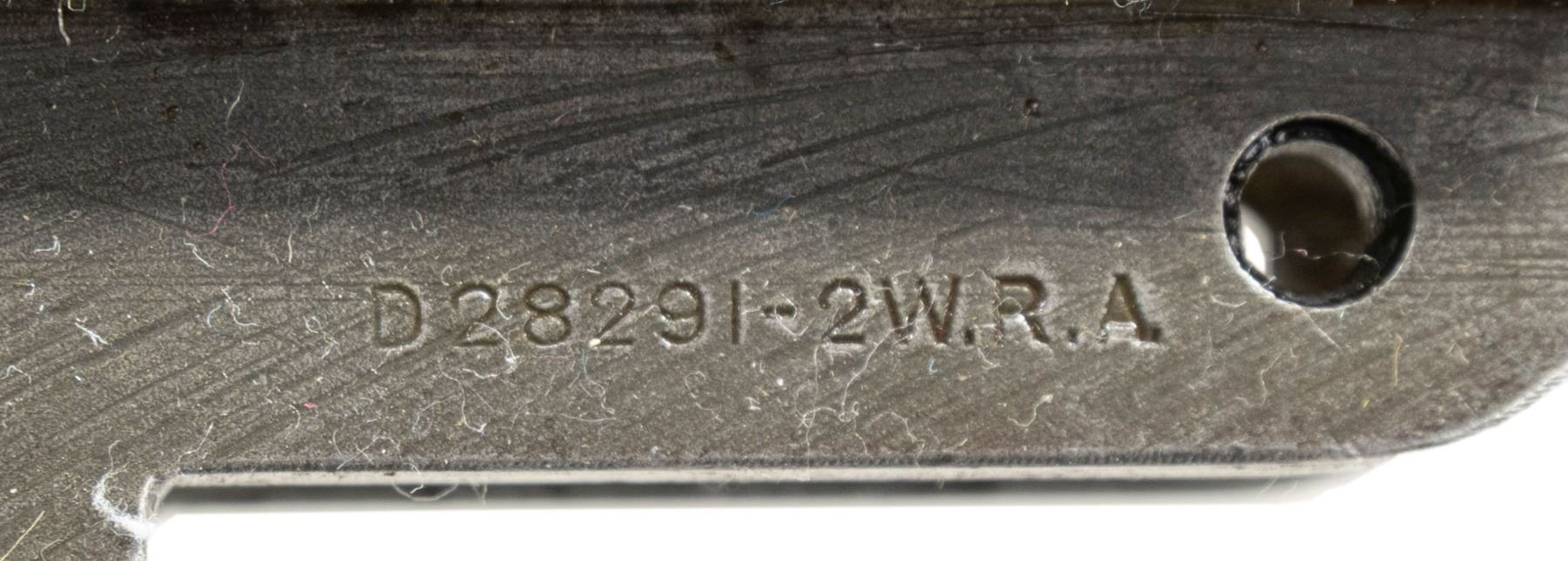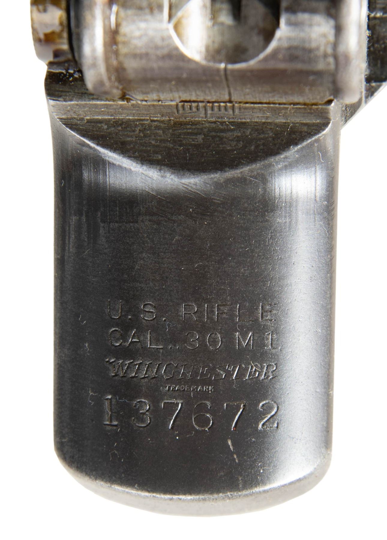 S# 137672. Receiver marked at heel "U.S. RIFLE / CAL. .30M1 / WINCHESTER / serial number". Marked on right forward end "D28291-2 W.R.A.". Receiver manufactured in 1941. Clip latch assembly, rear sight base & spring cover are present. CONDITION: receiver has moderate wear, but retains a small amount of its original finish. (25-2904/RW). MODERN. $300-500.