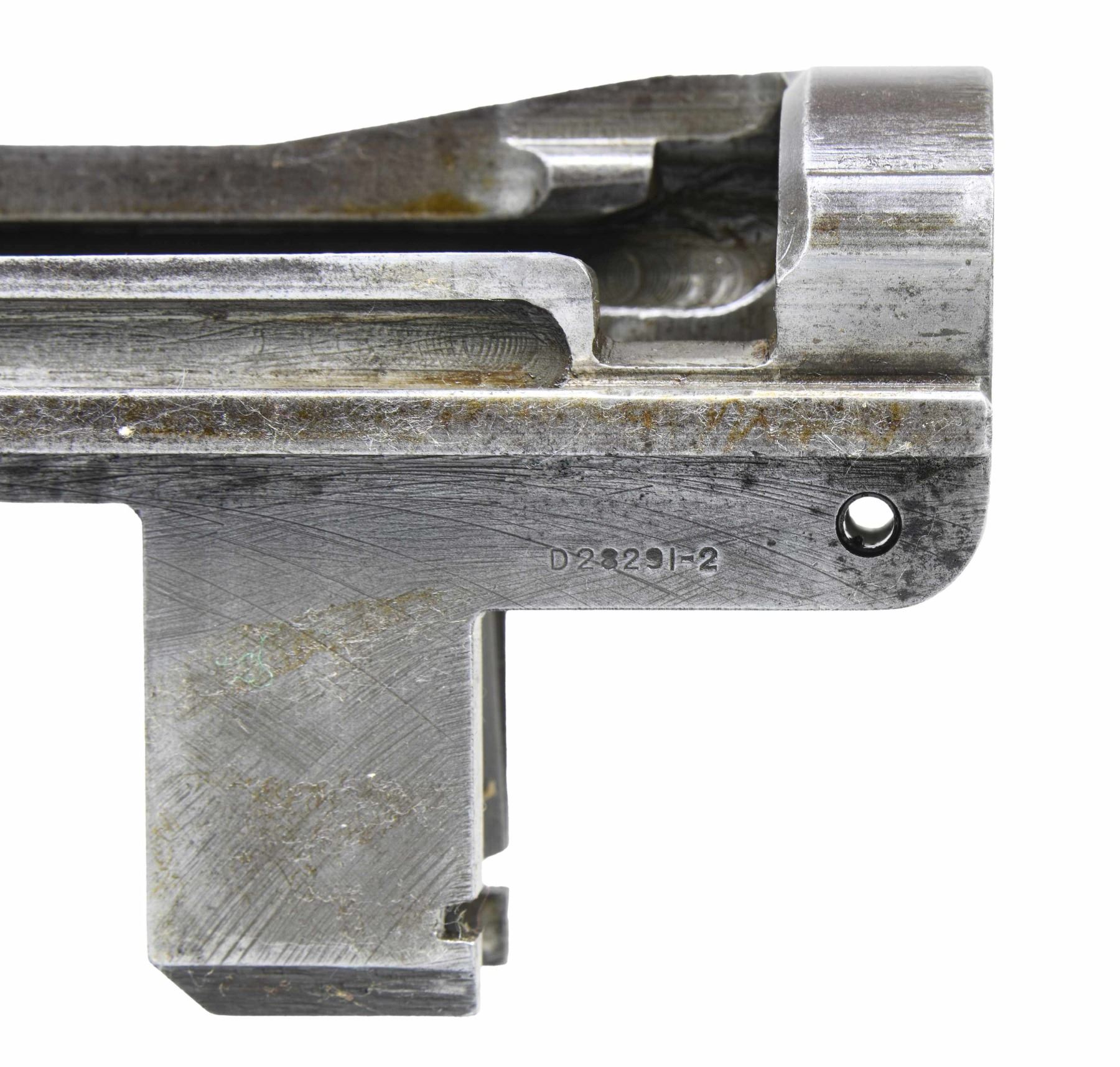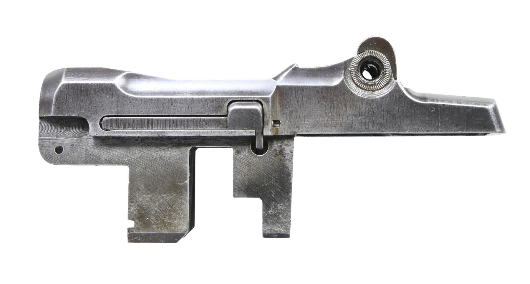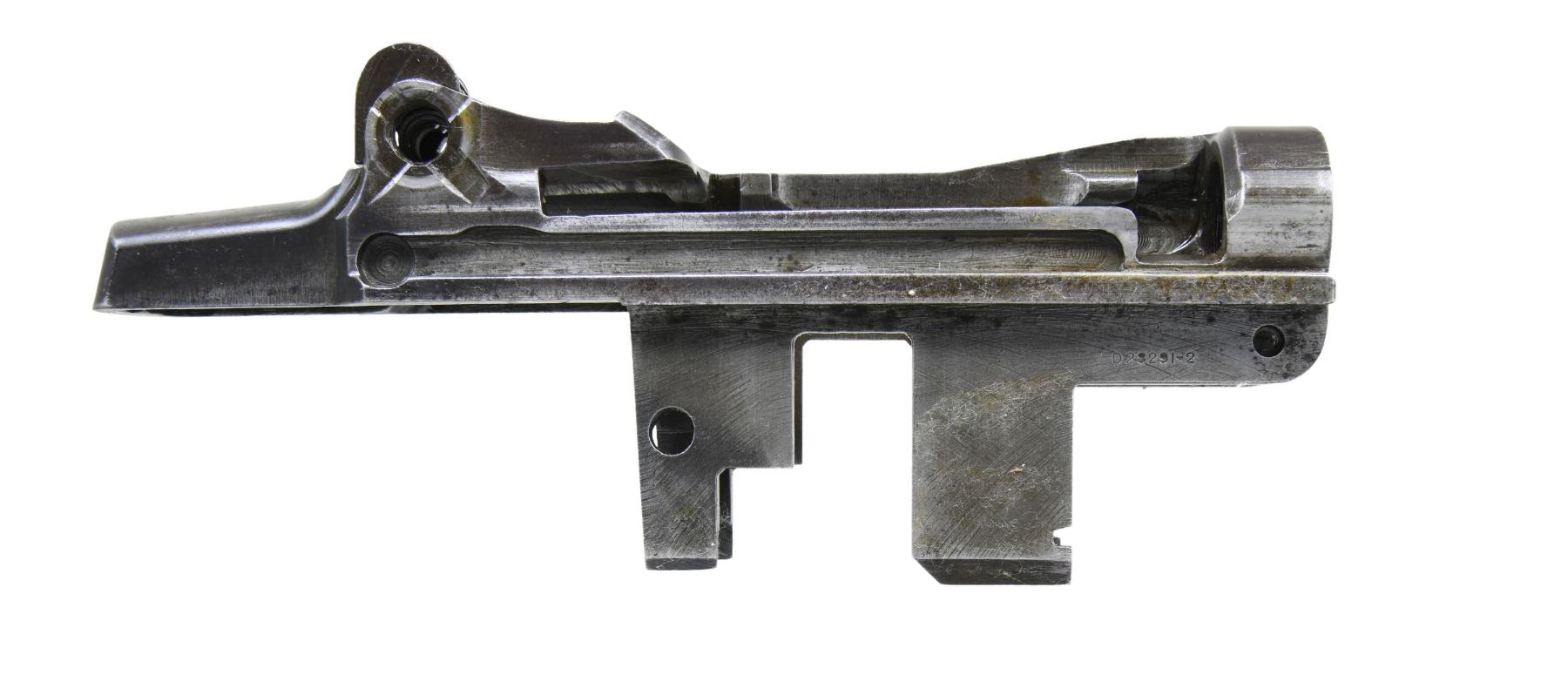 S# 150249. Receiver marked at heel "U.S. RIFLE / CAL. .30M1 / WINCHESTER / serial number". Marked on right forward end "D28291-2". Receiver manufactured in 1942. Clip latch assembly, rear sight spring cover, sight base & aperture are present. CONDITION: receiver moderate wear & traces of original finish turning gray. (25-2905/RW). MODERN. $300-500.