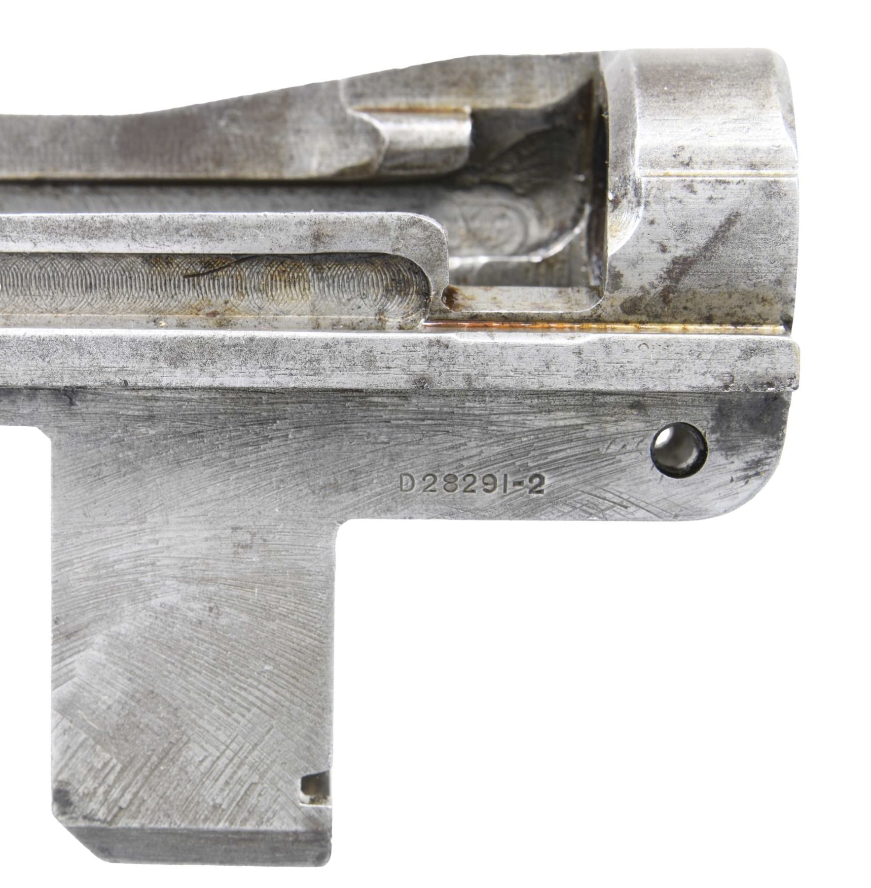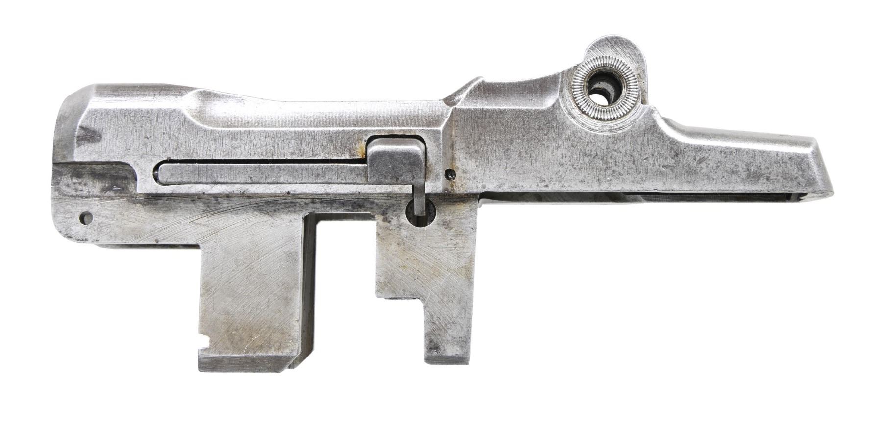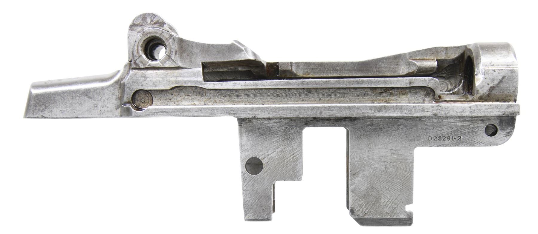 S# 1221126, indicating manufacture in 1942. Receiver has standard Winchester markings at heel. Drawing number on right forward end "D28291-2". Receiver is also marked underneath rear of right rail "K", "P" & a punch mark. Parts remaining attached to receiver include clip latch, rear sight base & spring cover. CONDITION: receiver is turning gray & patina w/ small areas of light oxidation. (25-2899/RW). MODERN. $300-500.