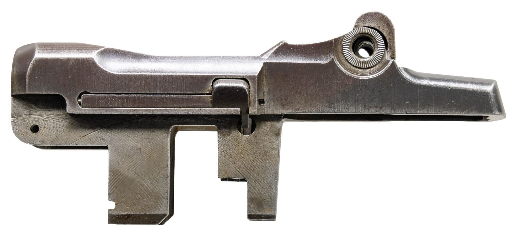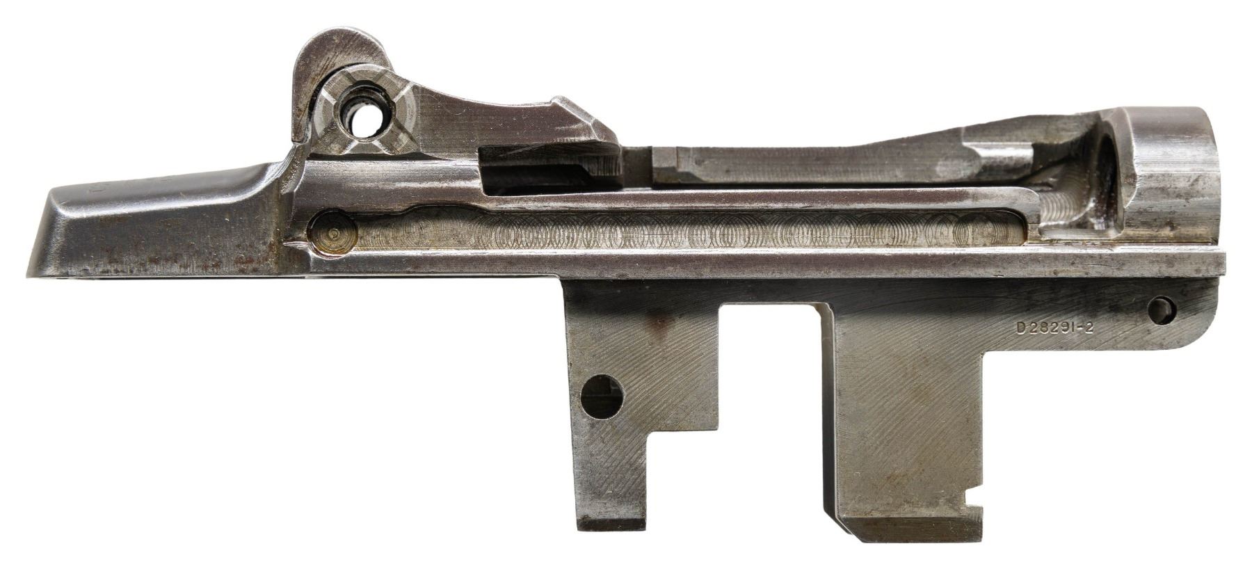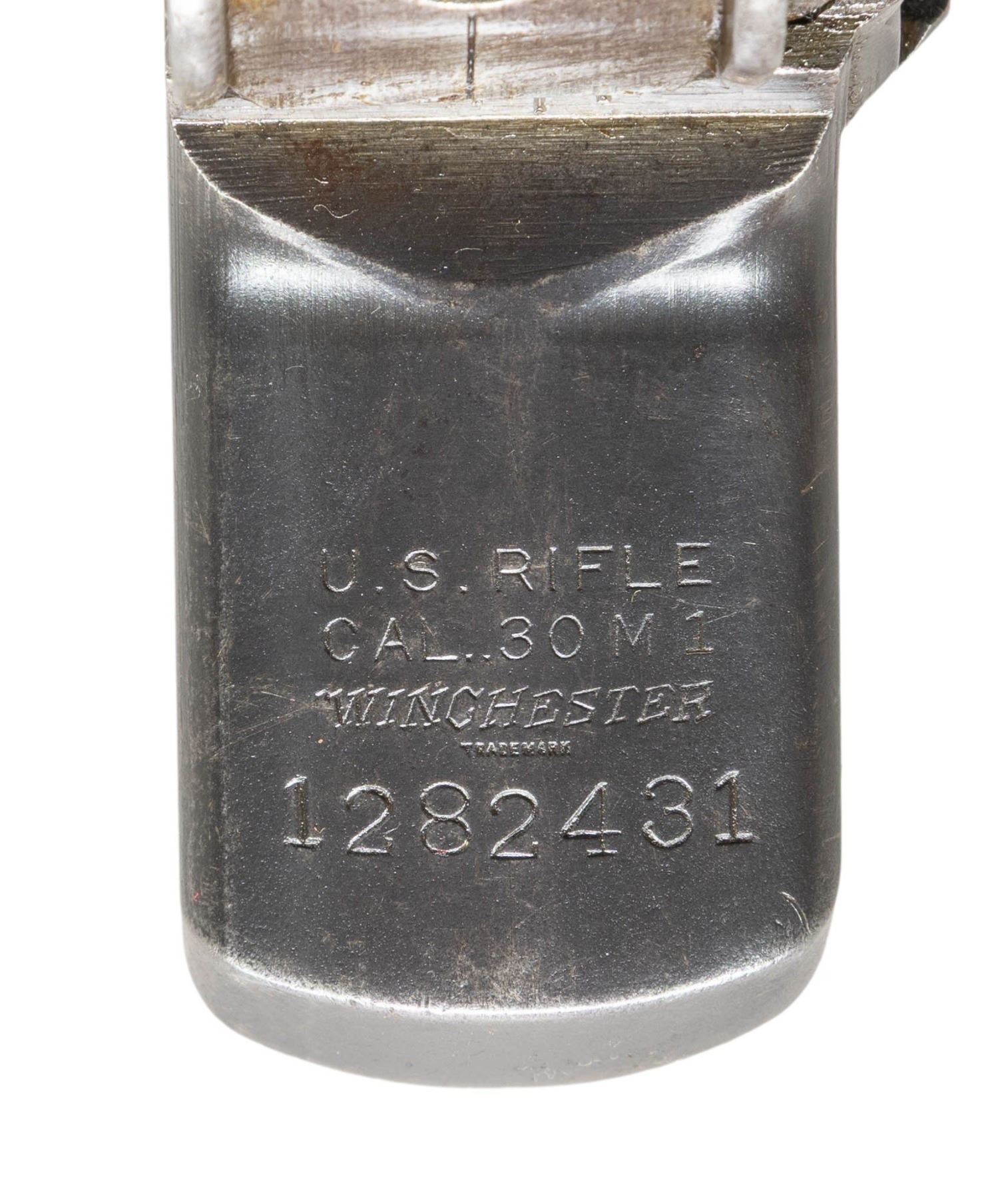 S# 1282431. Receiver marked at heel "U.S. RIFLE / CAL. .30M1 / WINCHESTER / serial number". Marked on right forward end "D28291-2". Receiver manufactured in 1943. Clip latch assembly, rear sight spring cover & sight base are present. CONDITION: receiver has turned overall gray w/ traces of original finish & moderate wear throughout. (25-2906/RW). MODERN. $300-500.