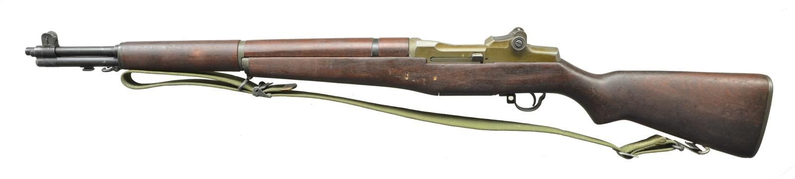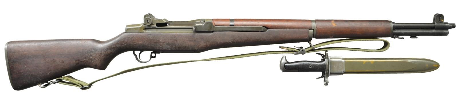 RIFLE. Cal. 30-06. S# 2402983. Bbl. 24" marked “SA” dated “8-65”. Throat gauges 1.0; muzzle gauges less than 1.0. Adjustable aperture rear sight. Blade front sight w/ protective ears. Receiver is marked on right forward leg in faint electro pencil “RRAD 9-65” indicating arsenal overhaul at Red River Army Depot. Bolt, operating rod & hammer marked “SA”. Trigger housing marked “HRA”. Safety marked “MXR”. Walnut stock set. Buttstock marked only under grip w/ boxed “P” proof. Trap buttplate. Green web sling. UNATTACHED ACCESSORIES: 9-7/8” fullered blade M1 bayonet. Marked on left Ricasso w/ “U.C.” “flaming bomb” & “U.S.” Brown ribbed composite grips. Green plastic scabbard marked w/ “U.S.” & “flaming bomb”. Bayonet has been sharpened & shows grinding marks at tip. Parkerized finish is turning overall gray w/ wear & handling marks. Grips show moderate wear & handling marks. Scabbard is worn but serviceable. CONDITION: replacement buttstock has light wear & staining w/ moderate handling marks throughout. Handguards have notably better appearance but also w/ scattered handling marks. Metal has original Parkerization w/ thinning & light wear. Shiny bore w/ sharp lands. (22-4200/RW). CURIO. $800-1,200.
