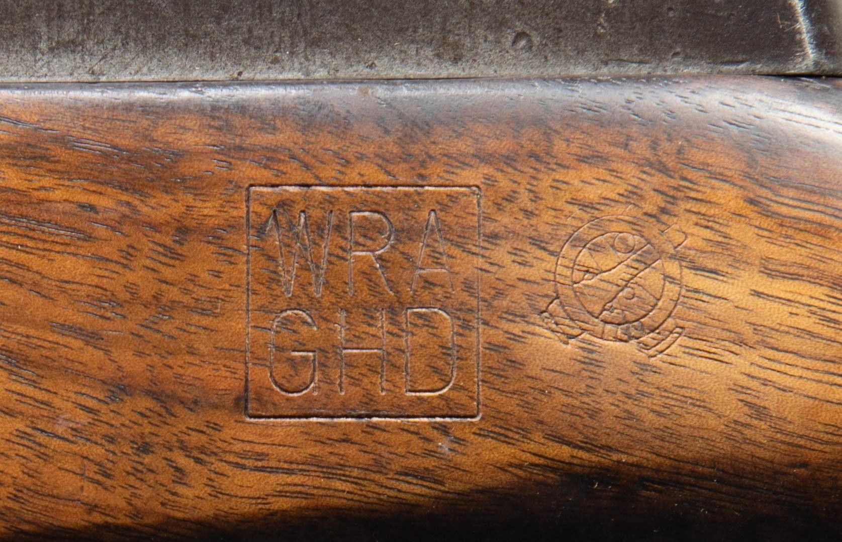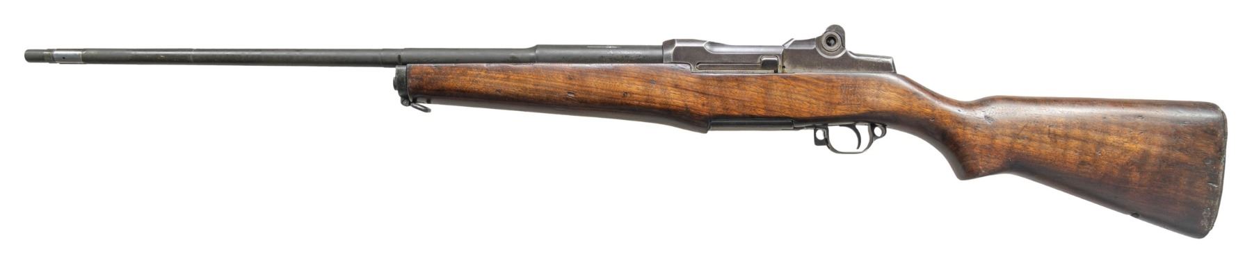WINCHESTER RELATED PARTS. Cal. 30-06. S# 1604947. Bbl. 24". Throat gauges 2.0. Muzzle gauges 1.0. Barrel is marked on top "D35448W.R.A.". Barrel is marked on the right side w/ "WP" proof. Receiver carries the standard Winchester markings at heel & the desirable "D28291WIN-13" marking on the right front of the receiver below the wood line. These receivers were given the "WIN 13" markings as they were produced in 1943, but not assembled into rifles until production was nearly ended. Incomplete rear sight consists of movable base, aperture sight & retaining clip. Front sight gas cylinder, lock & lock screw are not present. Winchester trigger assembly marked on left side "D28290-W.R.A.". Hammer is marked "C-46008-1" followed closely by "W.R.A.". Operating rod w/ relief cut is marked "D35382-W.R.A.". Milled trigger guard is marked "C 46025" followed by "W.R.A.". Walnut stock w/ ferrule & sling swivel is Winchester production & has the boxed "WRA / JHD" & "crossed cannons" which appear to be refreshed. Faint encircled "P" proof under grip. Trap buttplate is not present. Walnut front handguard w/ heat shield & ferrule. Walnut rear handguard w/ retaining clip. CONDITION: stock set has well-worn arsenal rework finish w/ numerous handling marks throughout. Handguard has notable repaired crack on the upper right side. Receiver has wear, turning gray & patina w/ small spots of oxidation & very fine pitting. Barrel retains 70% of its arsenal rework parkerized finish. Trigger guard assembly has turned an overall worn gray. Good shiny bore w/ lightly worn lands. (25-2911/RW). MODERN. $400-600.