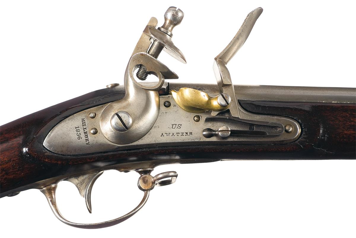 This is an example of a Third Type Model 1816 flintlock musket from a contract for 21,560 muskets manufactured by Asa Waters of Millbury, Massachusetts between 1817 and 1836. This musket was finished bright with casehardened lock plate and removable brass flash pan. It has the Waters Third Type marking of "US / A. WATERS" in front of the hammer and "MILLBURY / 1836" vertically behind the hammer. Without a date on the tang. The barrel at the breech is marked "US / JM / S.N.Y. / P" and a script "JM" cartouche on the left side of the stock. Three iron barrel bands, a ramrod, and sling swivels. The buttplate tang is marked "US" and "45"