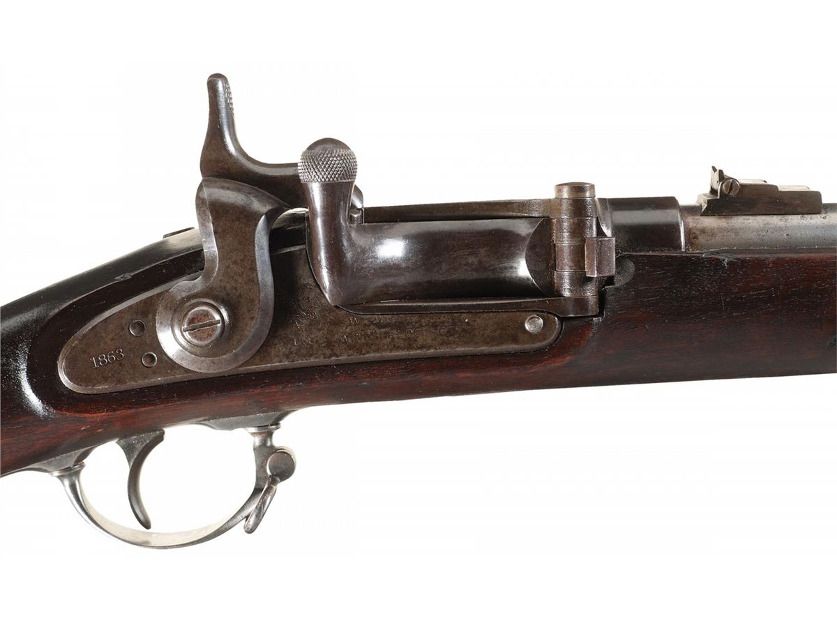 Manufactured in 1863, and later converted to a breechloader using the Needham system; the original breech was cut away with a side-swinging trapdoor and extended hammer striker installed. Blade front and 3-leaf rear sights, with the lock plate marked "1863" behind the hammer and "eagle/U.S." and "Wm MUIR &CO.(partially removed during conversion)/WINDSOR LOCKS, CT." ahead. Smooth straight wrist stock, with three "U" marked barrel bands, sling swivels, and a smooth "US" marked buttplate.