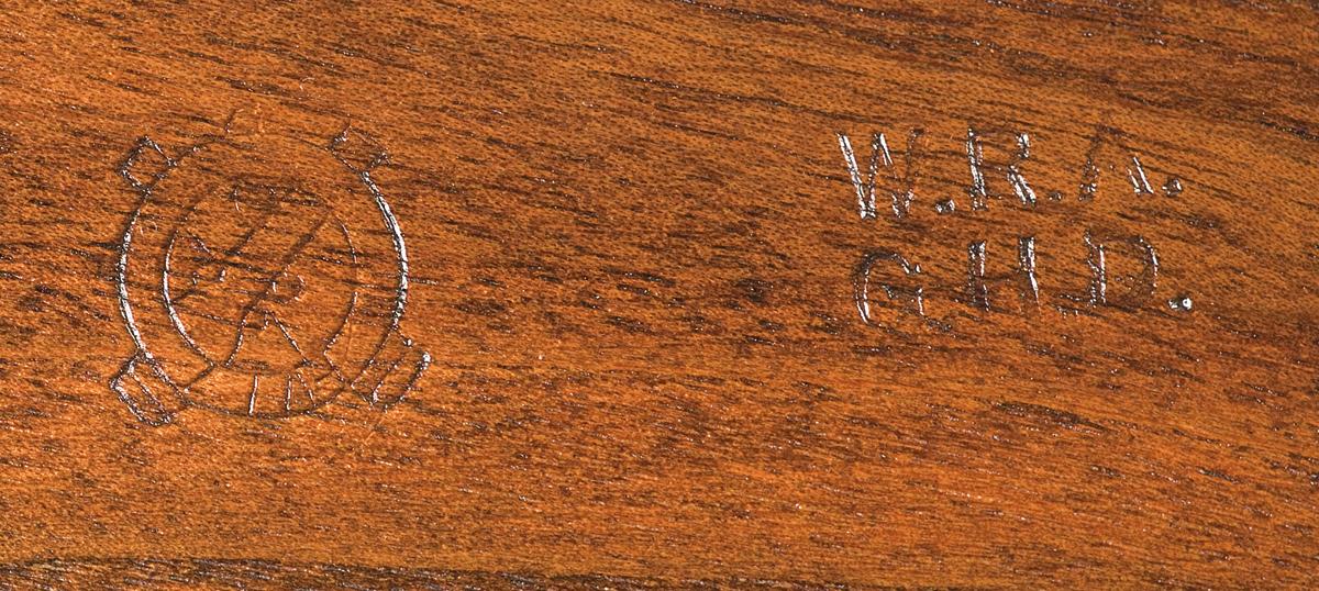 Standard receiver markings with a "W" and oval proofed barrel, the right side of the rear sight is marked with an "H" inside a shield, magazine release marked "M" and left side of the safety button is marked "EW". Parkerized finish with blue flat bolt and magazine, and mounted with a low wood pistol grip stock with oval oiler cut out. The right side of the buttstock is restamped with the cross cannon and "W.R.A. / G.H.D." cartouches and a small "P" on the bottom of the grip. Complete with a green canvas sling, and a grouping of CMP paperwork.