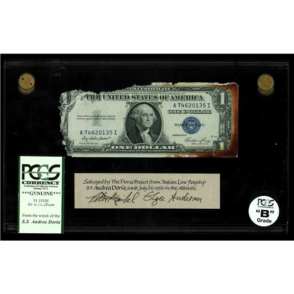 USA, $1 silver certificate, series 1935E, serial A74620135I, Priest-Humphrey, PCGS Currency Grade B, ex-Andrea Doria shipwreck (1956), with display bo