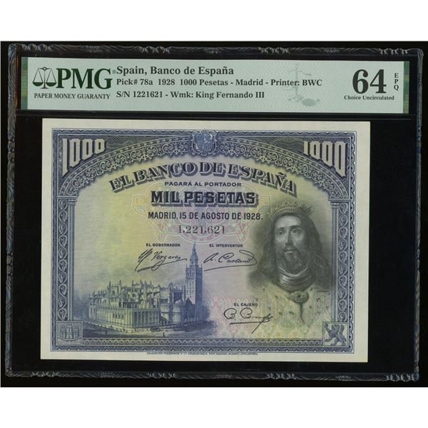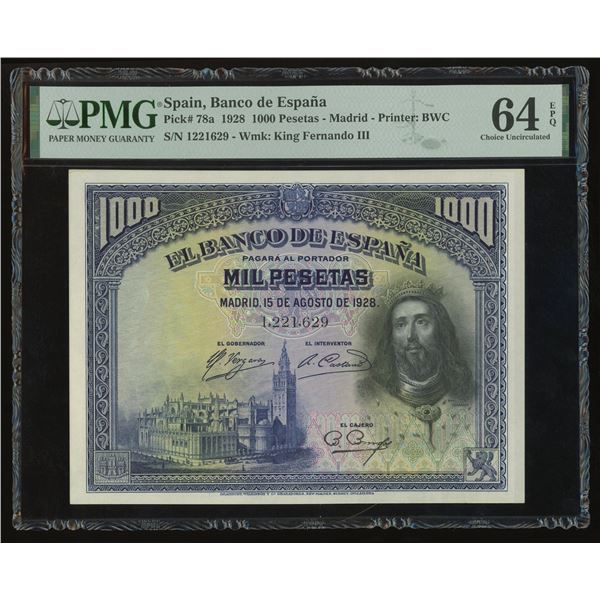 Madrid, Spain, Banco de Espana, 1000 pesetas, 15-8-1928, serial 1221621, PMG Choice UNC 64 EPQ. SCWPM-78a. Popular large size note with a vignette of