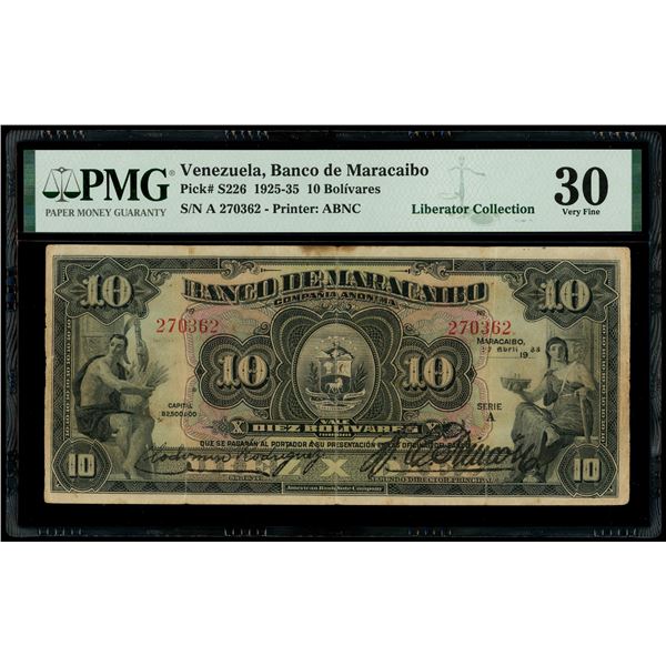 270 - Maracaibo, Venezuela, Banco de Maracaibo, 10 bolivares, 17-4-1933, series A, serial 270362, PMG VF 3Sedwick & Associates, LLC