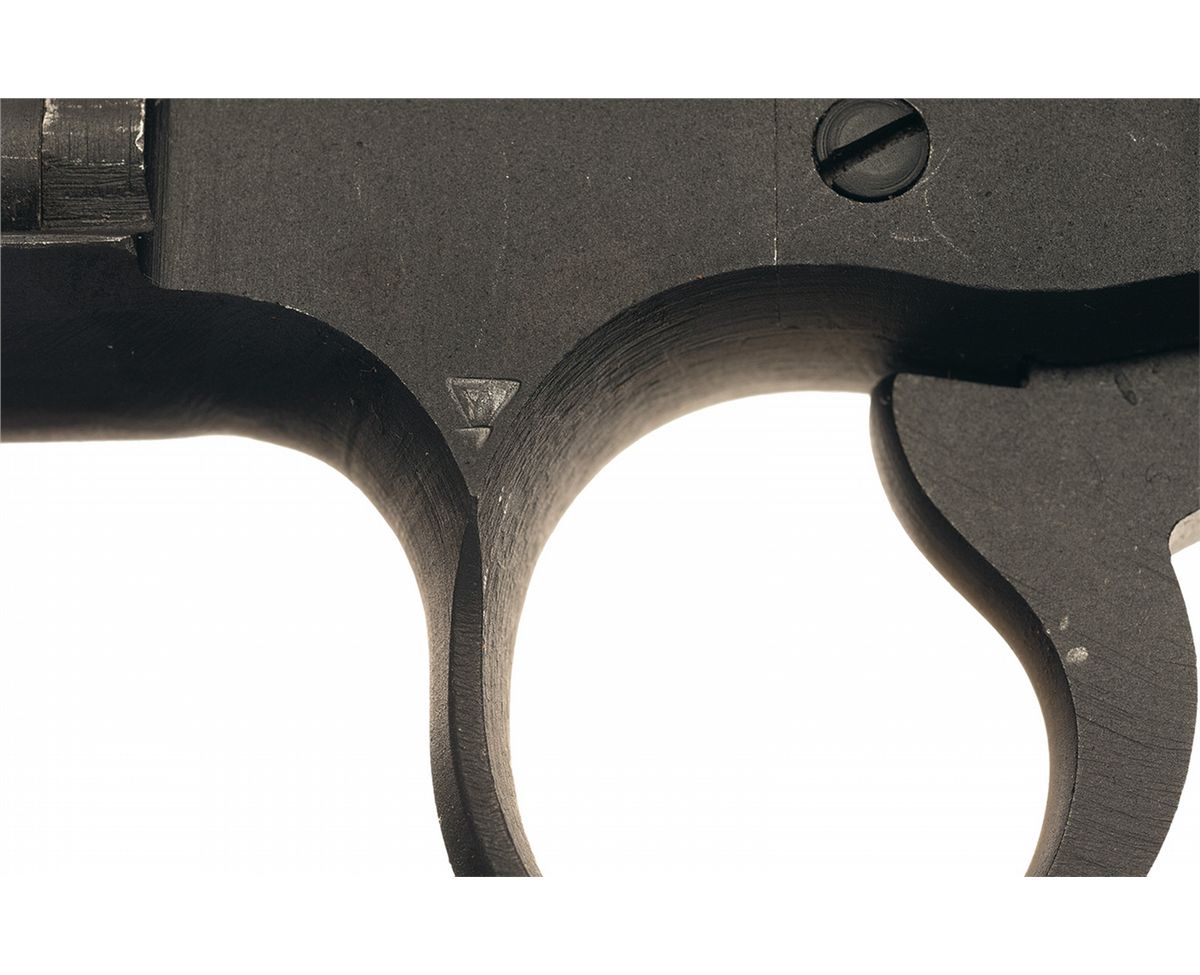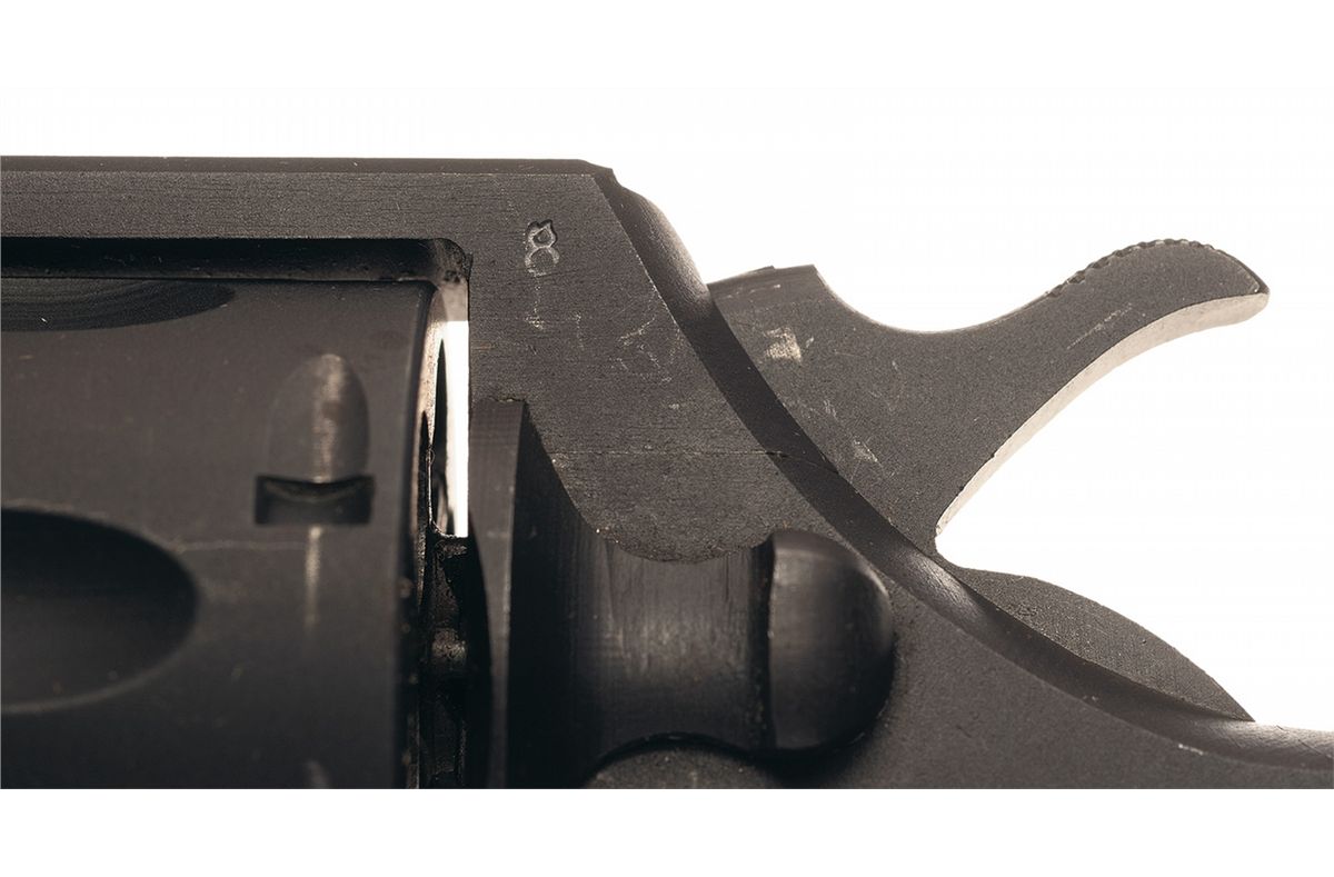 Produced circa 1942-1943. Fixed blade and notch sights, with the proper two-line markings on either side of the barrel and the "ordnance bomb" stamp on the left side of the frame. With a shipping box made out to 1st Lieutenant George E Kelly of the 346th Signal Service Company, Colt Commando manual and test target, barrel brush in cardboard sleeve and a note signed by and letterheaded to George Kelly, stating that he purchased the revolver as Naval Ordnance Surplus in Saipan in April of 1945. No additional information on the Lieutenant or his Company was available at the time of writing.