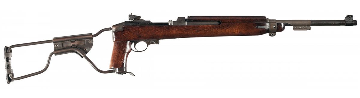 Inland barrel dated "2-43", Type III band, flat bolt, button safety and milled trigger guard. Smooth pistol grip stock, with "P" on the grip, "A A W" on the left side, leather cheekpiece and checkered steel buttplate marked "B257614 11".