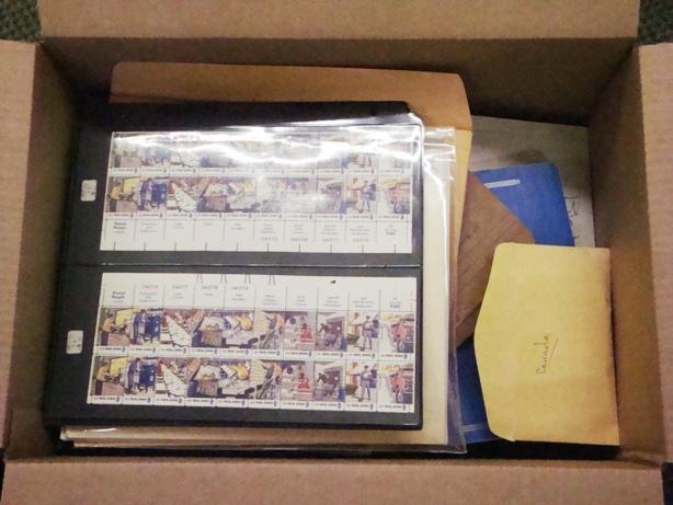 Large, heavy box crammed with auction remainders, stamp collections, decent Canada and U.S. material, general worldwide, junk to better. Needs a lot of sorting. Est.$300-500