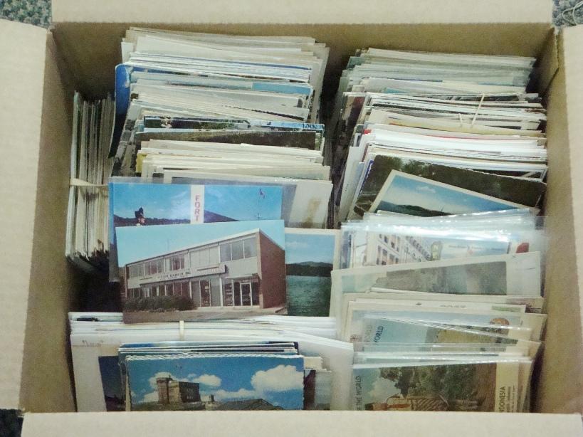 Few (1000) cards, mostly European views, towns, cathedrals, etc., unused and used. Some good U.S. cards as well incl. Expos, Fairs, some good Boy Scouts, Trains, etc. Well worth a long review. Est.$300-400
