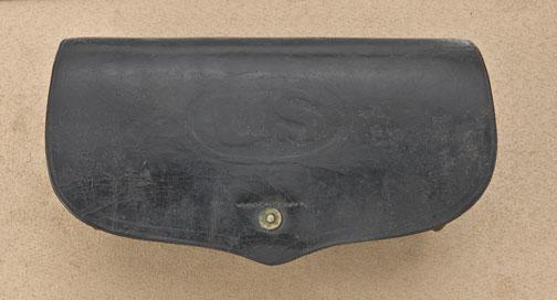 U.S. cartridge box showing large US on front, TML inspection on tab. Original loops on rear, later wood block inserted with four holes for 12-ga sized shells, which is an old addition. Early Indian war period. Possiblyfor use with a forager. Est: $150 - $300