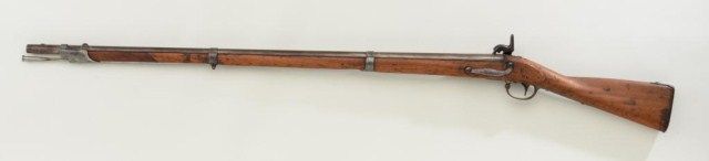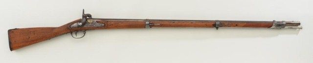 U.S. flintlock converted to percussion A. Waters rifle, lockplate dated 1828, .69 cal., 42” barrel, three barrel bands, flared iron ramrod, full length wood stock. This gun is in overall fair to good condition showing abrown patina on metal surfaces, good markings including upper tang dated 1830 with breech P proofed and US marked and ET inspected; good action, dark bore, wood is dry and overall fair to good with replaced forwardapprox. 6” section. Est.: $450-$900.