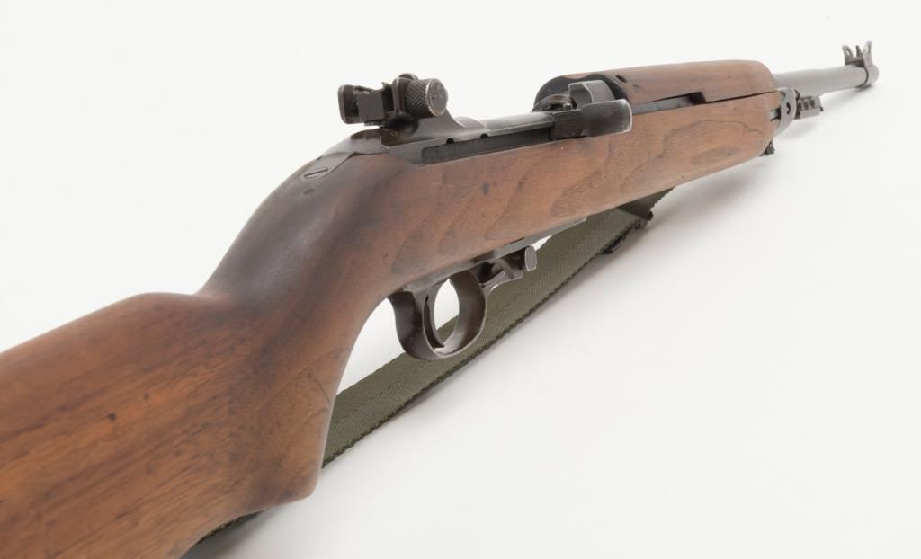 U.S issue .30 caliber M-1 carbine by Inland Division of General Motors in fair to good condition, serial number 406830. The barrel is also marked Inland and dated 6 – 43. The metal surfaces show a patina finish with some erosionand minor pitting. No import marks. The carbine has been fitted with later arsenal parts including bayonet lug and sight. The stock shows some small fill holes and refinishing. The sling is a later manufacture. The action works well and the bore is good. No clip. Est.: $300-$600
