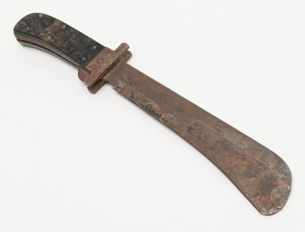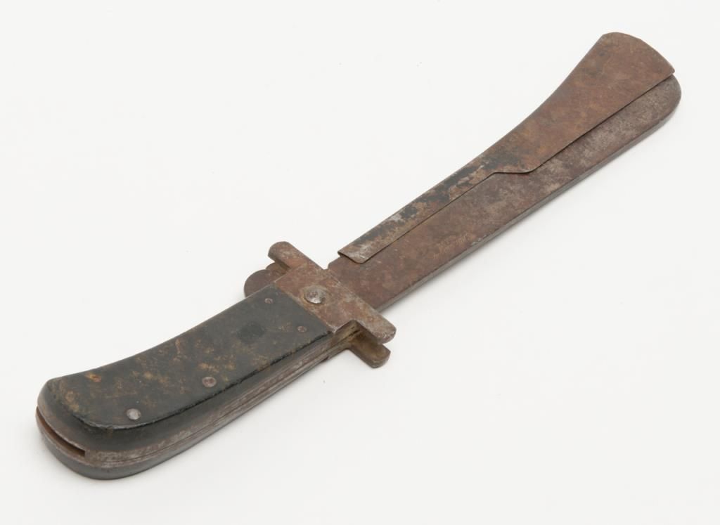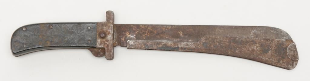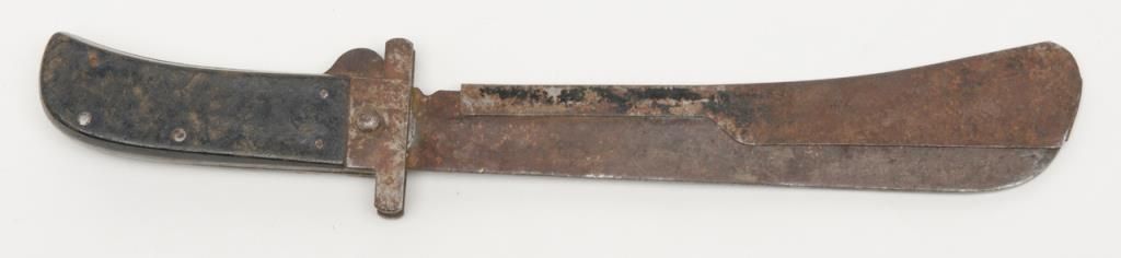 U.S. issue Bush knife by Cattaraugus with metal cover for blade in rough condition possibly used in South Pacific during World War II. Est.: $25-$50