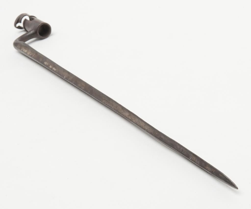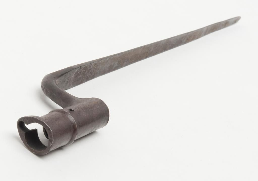 U.S.-marked Springfield trapdoor rifle bayonet (no scabbard) in overall out-of-the-attic fair condition showing a dark patina with general erosion; missing securing ring. Est.: $30-$60.