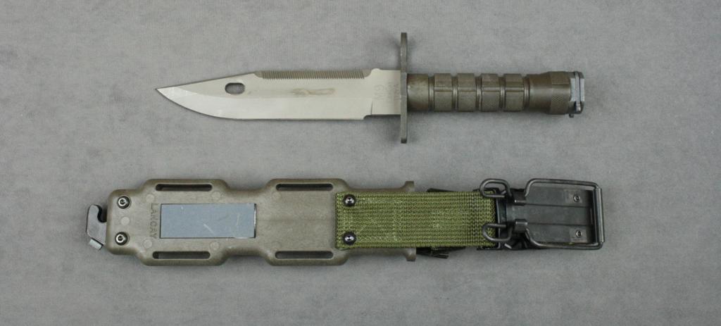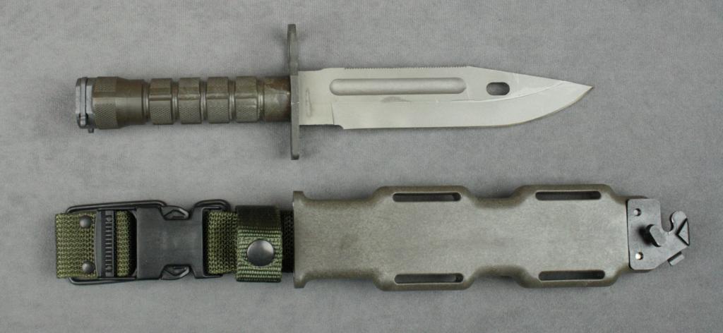U.S. military M9 bayonet and composite sheath  with woven hanger by Lan Cay in like new  condition, 2nd contract, fuller in blade,  long saw teeth, no web pouch or sharpening  stone cover.  Est.:  $200-$400.