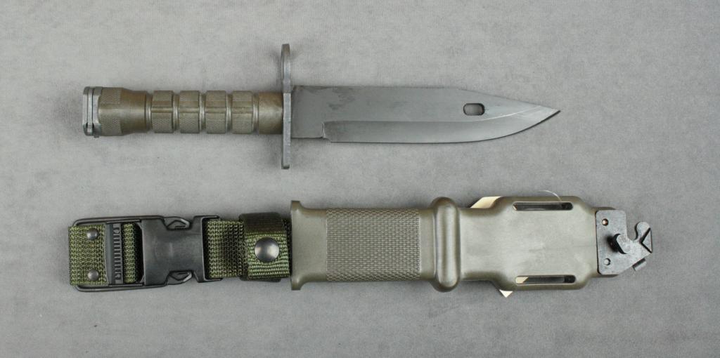 U.S. military M9 bayonet by Lan-Cay with composite sheath and woven hanger in excellent condition showing little handling. This bayonet appears to be a 3rd contract with no blade fuller, short saw teeth, nopouch and prototype webbing with hollow ground blade. Est.: $250-$500.