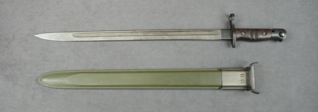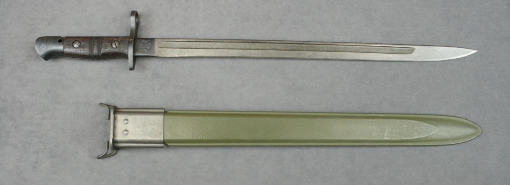 U.S. military Model 1917 bayonet and sheath in overall excellent condition; blade is dated 1917 and by Remington; the reverse of the blade hilt is U.S. marked with flaming bomb cartouche and other marks; sheath isU.S. flaming bomb marked and M-1917 with metal throat and olive green composite body. Est.: $150-$300.