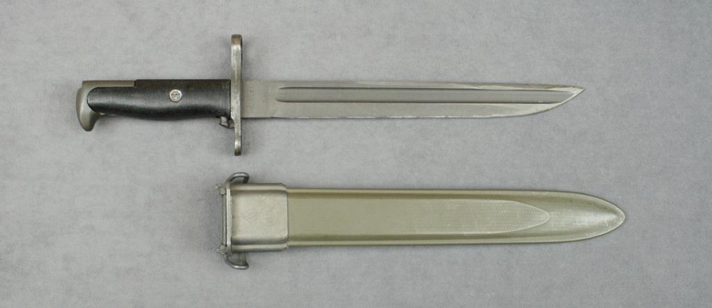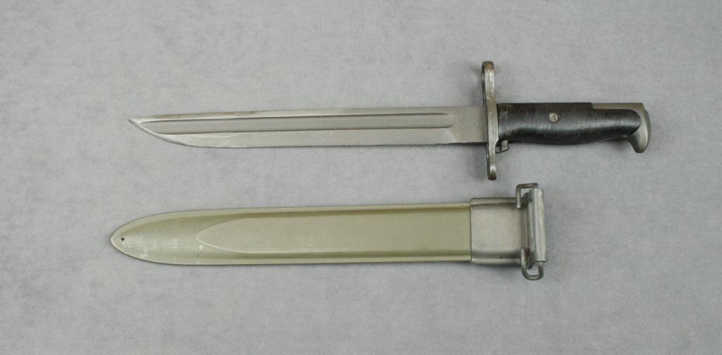 U.S. military bayonet and scabbard in overall excellent condition with S.A., flaming bomb and 1920 marked on one side of the hilt and U.S. 1152228; sheath is fine. Est.: $100-$150.