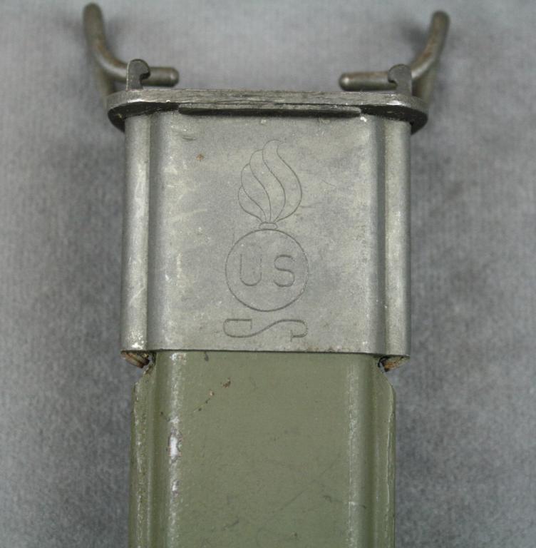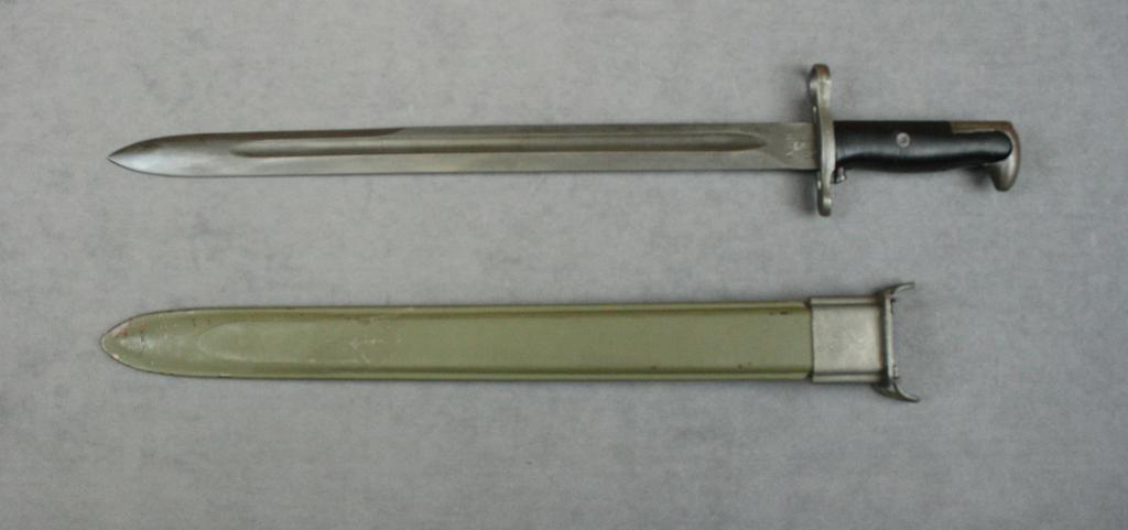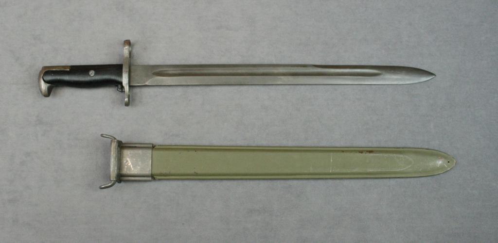 U.S. military bayonet and sheath, longer  1905/1942 style in overall fine condition  showing some wear to the point of the sheath;  blade is marked “AFH US with flaming bomb  proof and dated 1942 on one side of hilt.Est.:  $175-$350.