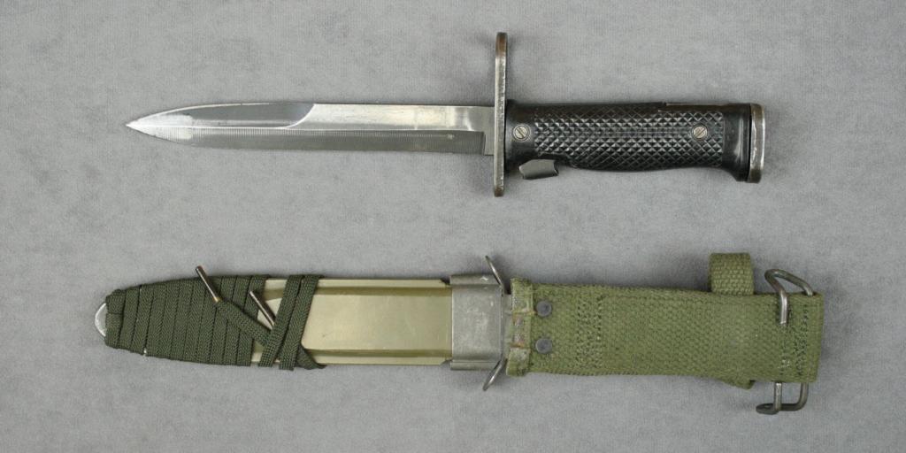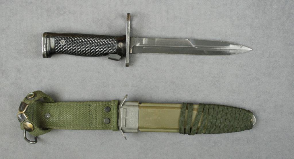U.S. military bayonet and sheath with woven hanger, throat of sheath marked U.S.M8A1 and PWH in overall very good to fine condition with woven tie down. Est.: $50-$100.