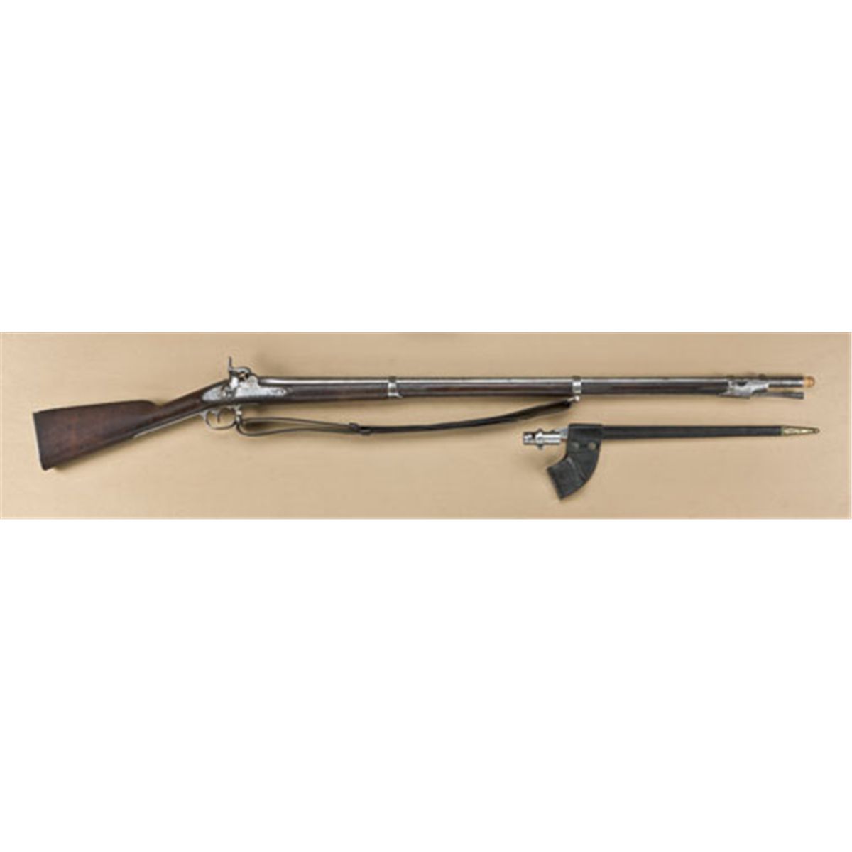 U.S. model 1842 Musket, .69 caliber, by Springfield, dated 1846. With bayonet, scabbard, ramrod, and sling. The metal surfaces show some light to moderate erosion and pitting. The markings on lock are verygood, the stock is also good with some normal wear, dings, mars, small losses and minor imperfections. The stock shows a feint outline of a cartouche, bayonet is very good with original brass-tipped scabbard in verygood condition with correct type leather sling. A good model 42 with hard to find bayonet and scabbard. Est: $1,250 - $2,500