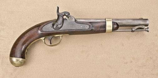 U.S. model 1842 Percussion military-issue pistol, approx. .52 caliber, with all features as standard on this model, dated 1851. The metal surfaces are good with a light grey-brown patina,s ome light erosionand pitting on barrel. Stocks are good with a few dings, mars, and scratches, and cartouches still visible. There has been a light coating of clear varnish applied. The lock markings are sharp, action is crisp,above average overall. Est: $700 - $1,400