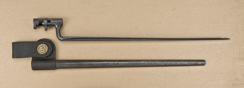 U.S. model 1873 bayonet for trapdoor Springfield with scabbard and leather hanger, blade is overall good to very good condition. Blade shows 75% toning blue, the scabbard shows 20-30% toning blue. There issome scattered erosion and pitting on the scabbard, just beginning age on bayonet. The leather hanger is fair to good and slightly cracked, soft from oiling. Est: $100 - $200